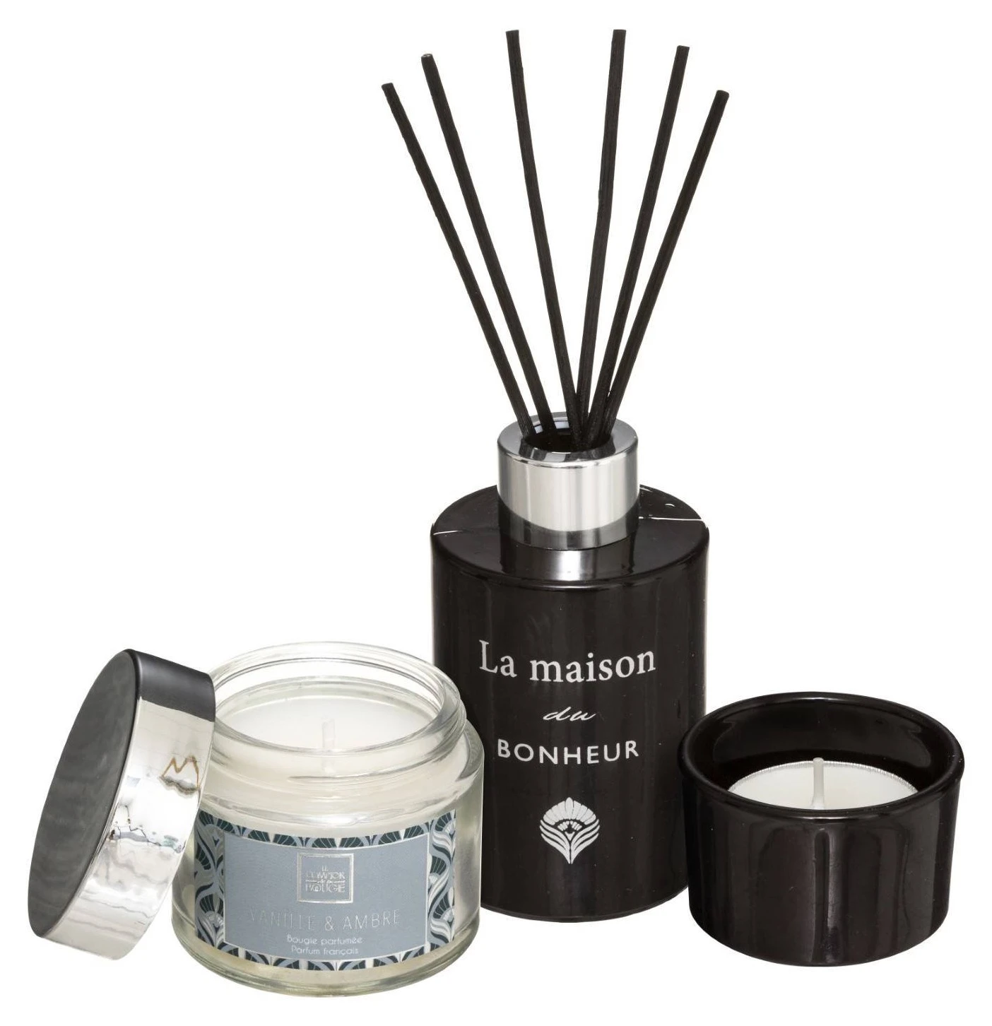 - Kerzen und Diffusor werden in einem eleganten schwarzen Farbschema mit einem blauen Twist, dem Produkt der bewährten Marke Atmosphera, gehalten
