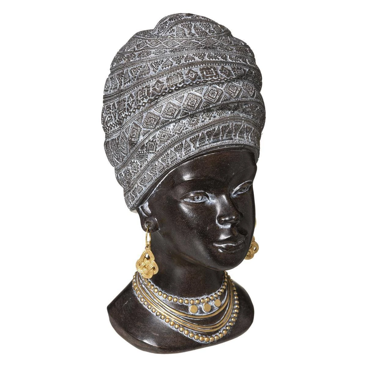 Die Dekofigur des Kopfes ist ein einzigartiges Dekorationsobjekt. Ungewöhnliche Dekoration – schließlich erwartet kaum jemand zu Hause einen Plastikkopf im silbernen Turban. Der Kopf aus dunklem Kunststoff zeigt ein fröhliches Gesicht, verziert mit einem interessanten Kopfschmuck und geprägtem Schmuck. Dies ist ein interessantes Accessoire im Ethno-Stil.