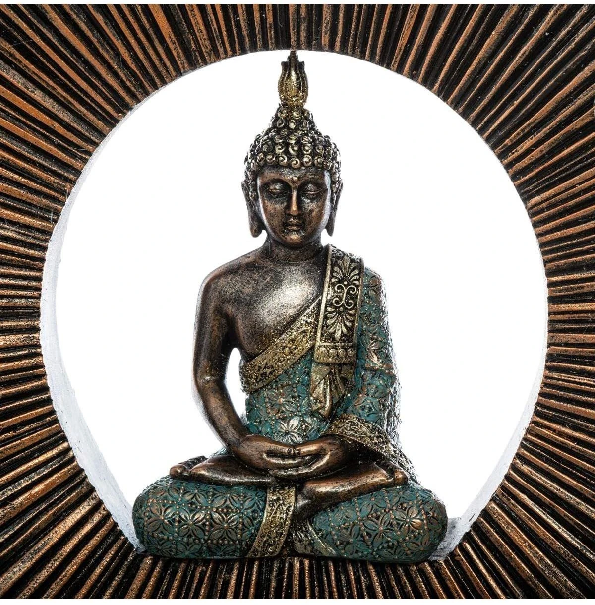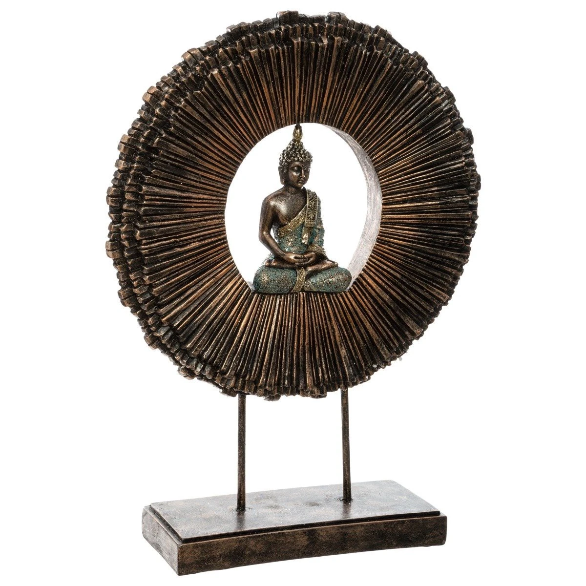 Dekoration mit der Figur des Buddha ist auf den ersten Blick nur ein Element der Inneneinrichtung. Das Produkt misst 37 x 11 x 49,5 cm und besteht aus einer Buddha-Figur, die in einen dekorativen Kreis eingeschrieben ist, der einem etwas Heiligenschein ähnelt, aus Kunststoff, der Bronze imitiert. Das Farbschema ist in natürlichen Erdfarben gehalten: tief, kupferbraun mit einem Hauch von Schwarz. Das Produkt wird als exotische, modische und ungewöhnliche Dekoration ideal für das Wohnzimmer oder Schlafzimmer dienen.