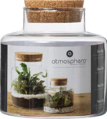 Das Glasterrarium mit Kork der französischen Marke Atmosphera, berühmt für seine spektakulären und praktischen Elemente der Einrichtungsgegenstände, hat einen Durchmesser von 12 cm und eine Höhe von 13 cm. So wird es ein kleines, charmantes Ornament für jede Wohnung, jedes Büro, jeden Balkon oder jede Terrasse sein, unabhängig von ihrem Einrichtungsstil.