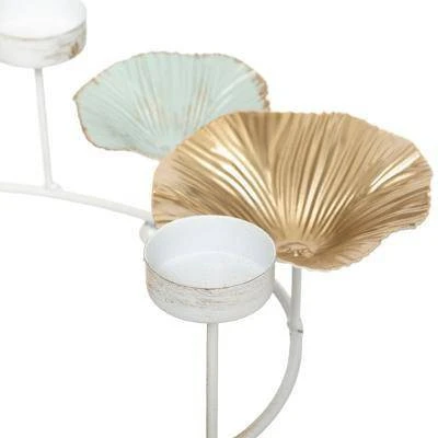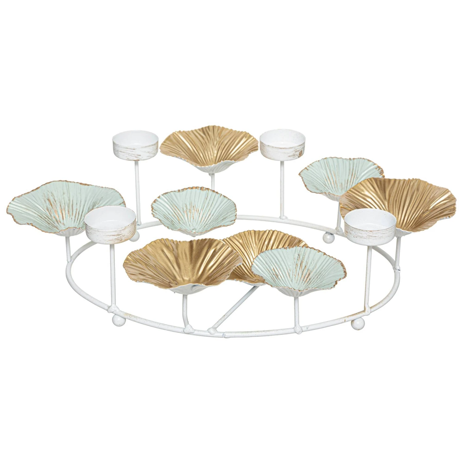 Metallkerzenständer für 4 Kerzen, 38 cm Ø, Weiß und Gold ist eine elegante Ergänzung des Hauses, die das Arrangement verschönern und sicherlich die Aufmerksamkeit der Gäste auf sich ziehen wird. Kerzen, die an strategischen Stellen angeordnet sind, verleihen dem Innenraum eine klimatische, heimelige Atmosphäre, und ein stilvoller, ansprechender Kerzenständer unterstreicht ihre Handwerkskunst.