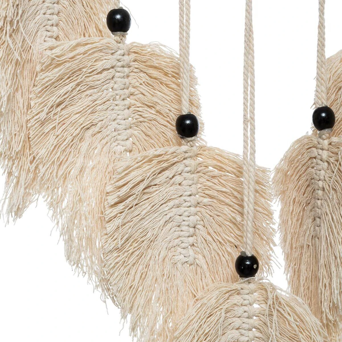 Das Produkt zeichnet sich durch symmetrische Muster aus, die aufgrund einer komplizierten Knotenkombination entstehen. Das SAFARI Makram wurde mit einer Baumwollschnur in natürlicher Beige gewebt. An der Unterseite befinden sich dekorative Fransen, die blattförmigen oder zarten Federn ähneln. Das Ganze zeichnet sich in erster Linie durch eine minimalistische Form aus, die in die Ästhetik des Boho passt.