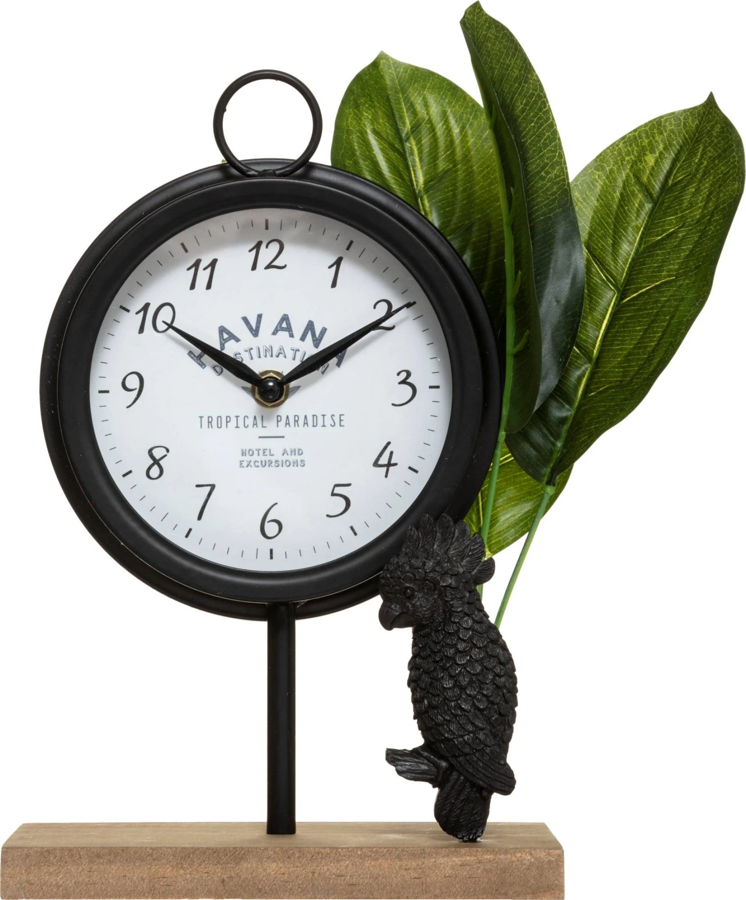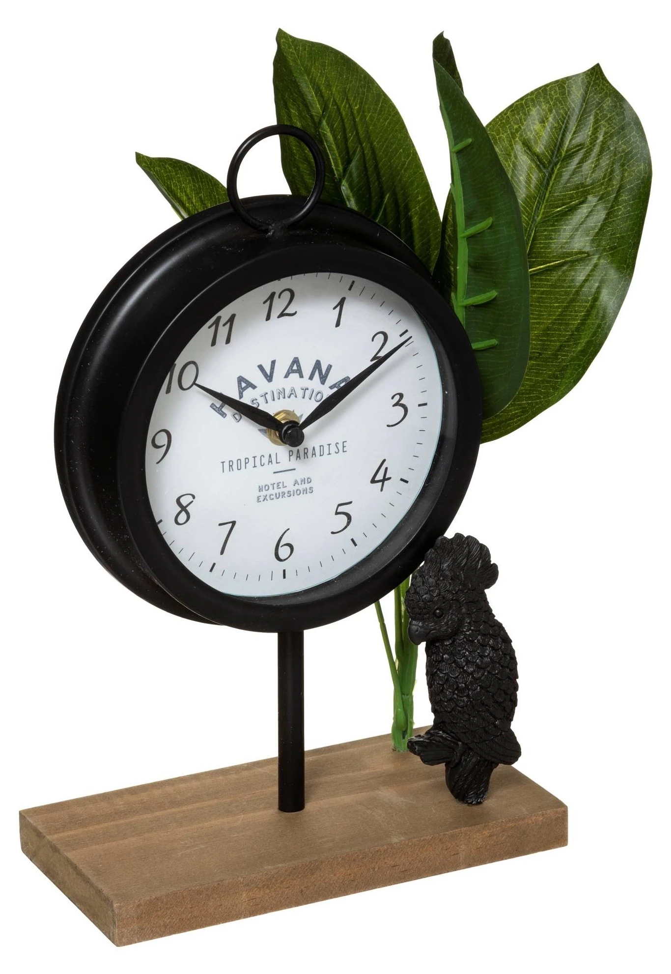 CUBA Tischuhr von Atmosphera verfügt über ein schwarzes Gehäuse und ein weißes Schild. Zubehör kann auf der Kommode im Wohnzimmer, im Bücherregal, im Nachttisch im Schlafzimmer oder auf einem Regal in jedem Raum platziert werden. Besonders hervorzuheben ist die Dekoration von Blättern.