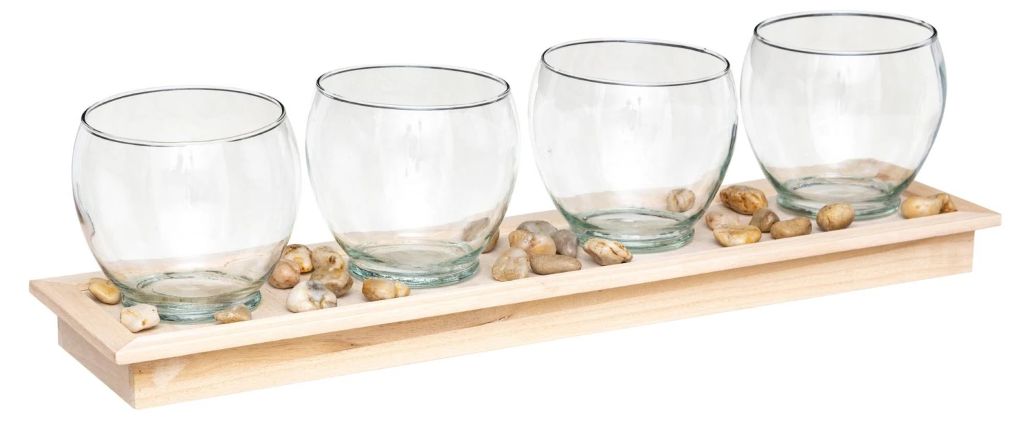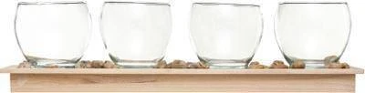 - Glaskerzenständer für 4 Kerzen, auf einem Holztablett,