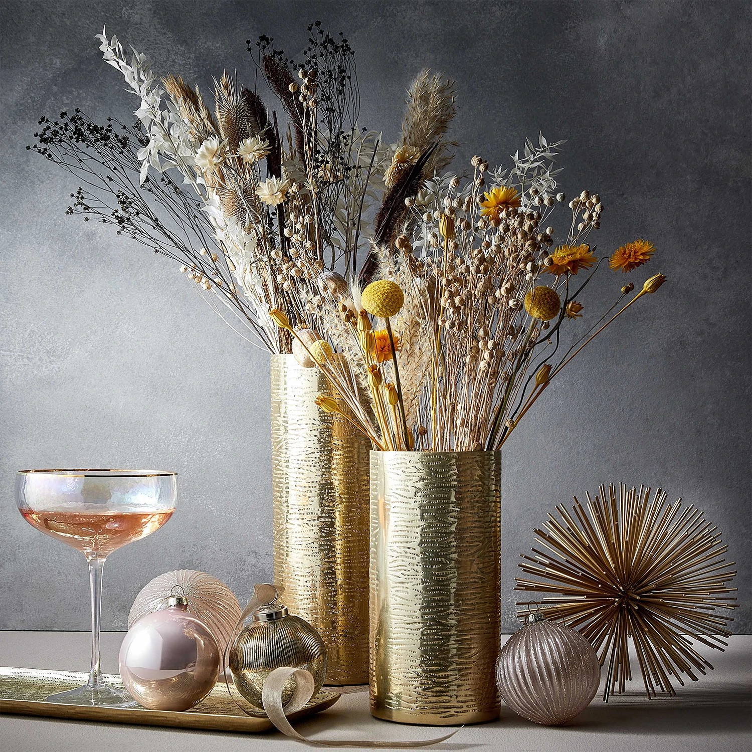 - Weitere Qualitätsmerkmale: Ein echter Allrounder für jeden Dekozweck und alle möglichen Blumen oder Sträuße ist die Aureo Metall Vase in Gold aus Aluminium. Mit ihrer klassischen Form und universellen Höhe von 20 cm passt diese Vase auf Beistelltische, auf die gedeckte Tafel oder auf Sideboards bzw. Kommoden. Dabei lassen sich auch mehrere dieser goldenen Vasen gruppieren, etwa mit unterschiedlichen Blumen – fertig ist die stilvolle Tischdekoration.
