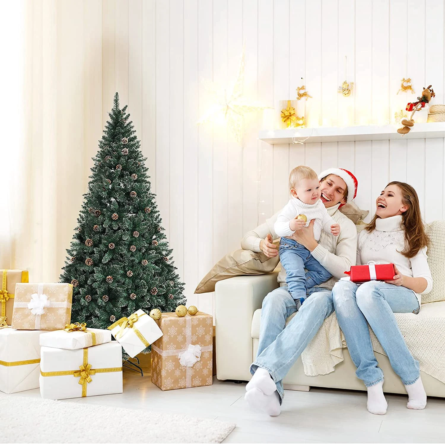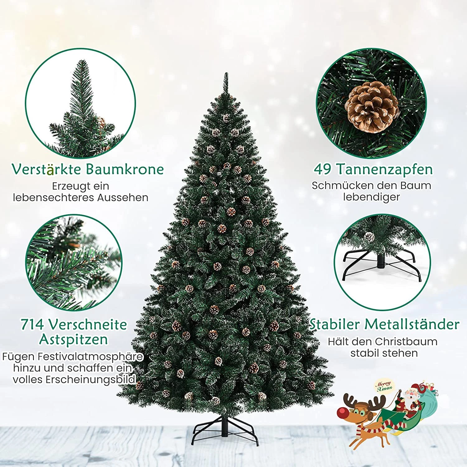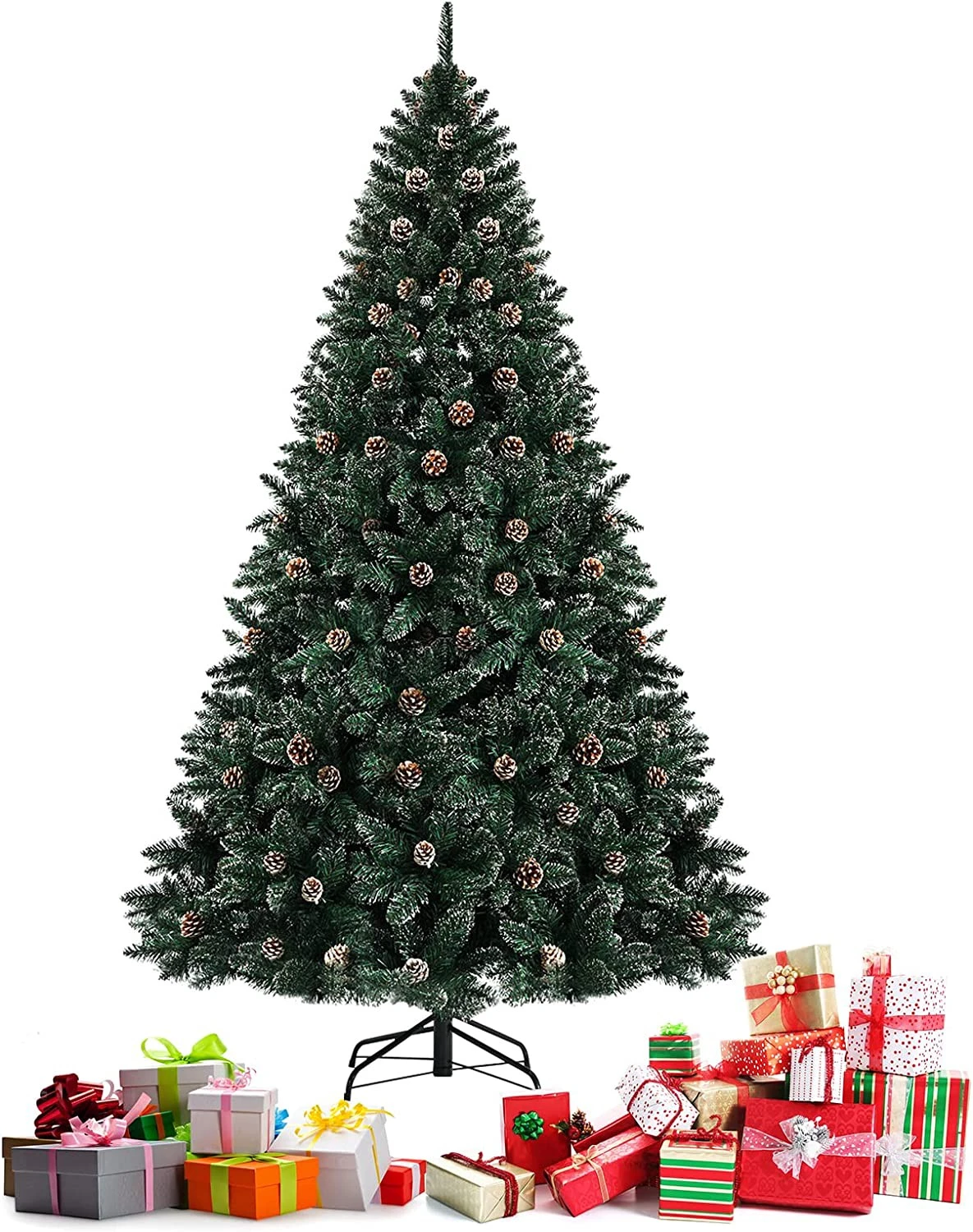 Suchen Sie mit Weihnachten um die Ecke nach einer perfekten Weihnachtsdekoration? Unsere Weihnachtsbäume bestehen aus flammhemmendem PVC-Material, das nicht nur sicher zu verwenden ist, sondern auch nicht leicht verblasst, um Sie durch mehr Feiertage zu begleiten. Ausgestattet mit 714 üppigen Astspitzen sieht der Baum unglaublich prall aus, und seine breiten Äste ermöglichen es Ihnen, so viele Dekorationen hinzuzufügen, wie Sie möchten, um den Baum zu verschönern. Darüber hinaus ist der Baum mit 49 Tannenzapfen und schneebedeckten Zweigen vorgeschmückt, um einen Hauch von festlicher Atmosphäre hinzuzufügen. Außerdem enthält unser Weihnachtsbaum einen robusten und langlebigen X-förmigen Metallfuß, damit der Baum gerade auf dem Boden steht. Um Energie und Zeit zu sparen, verfügt der Weihnachtsbaum über eine aufklappbare Konstruktion, die nicht nur leicht aufzuschütteln ist, sondern auch zur bequemen Aufbewahrung einfach zusammengeklappt werden kann.