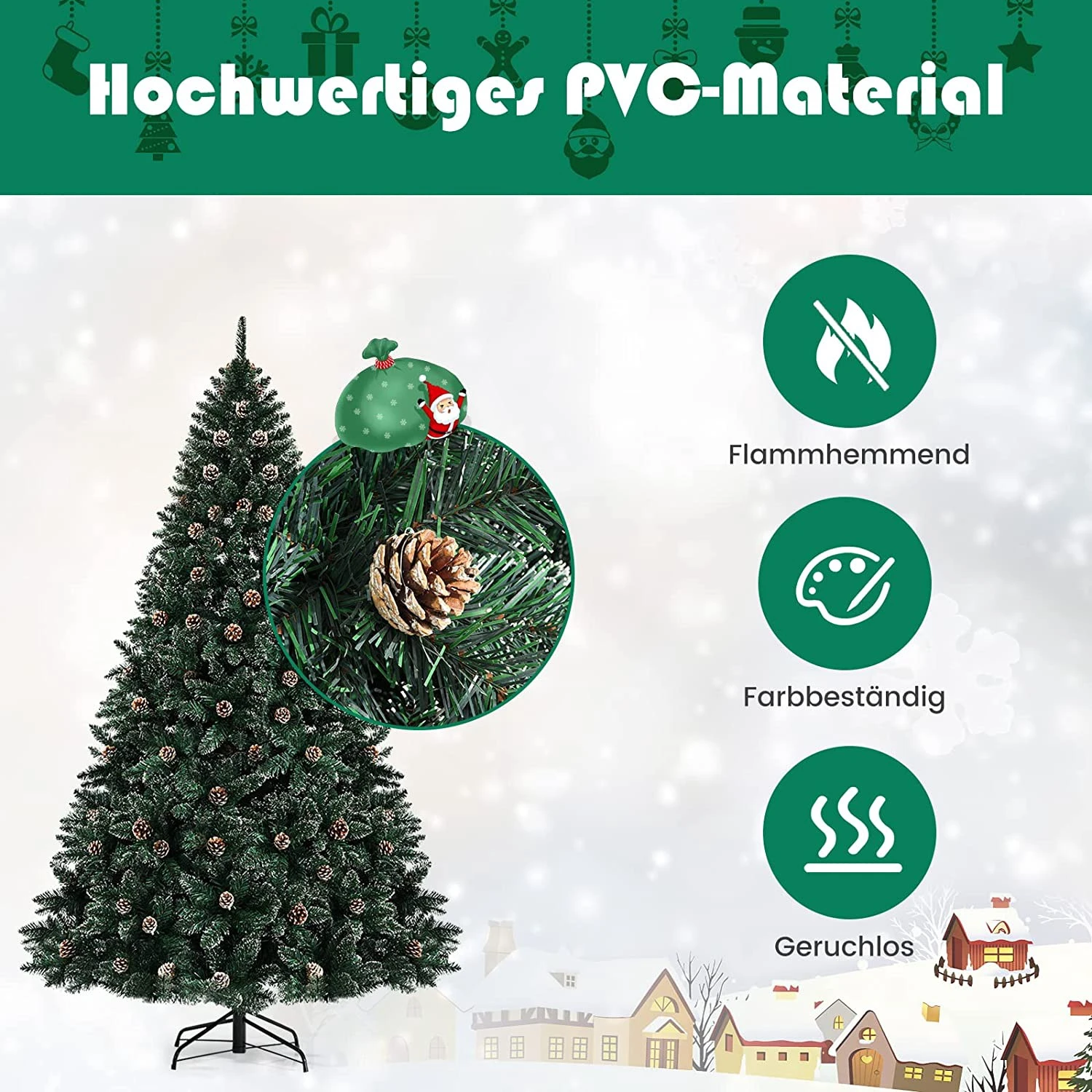 【Sicheres und langlebiges Material】Unsere Weihnachtsbäume bestehen aus schwer entflammbarem, hochwertigem PVC, das geruchlos ist und ihnen keine Allergien bereitet. Die PVC-Nadeln verblassen nicht leicht und sind immergrün durch die Jahreszeiten, um Sie durch viele unvergessliche Weihnachten zu begleiten.