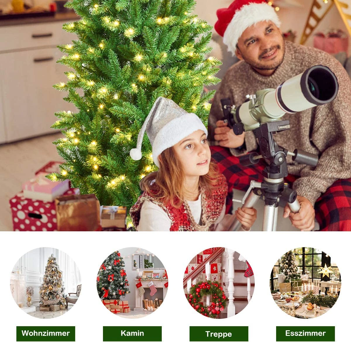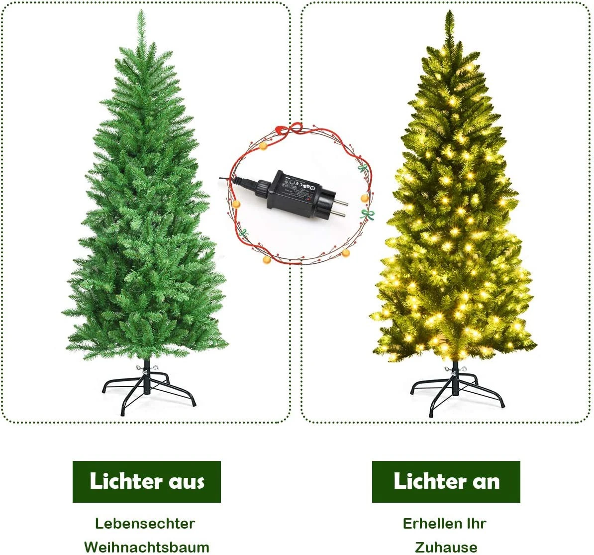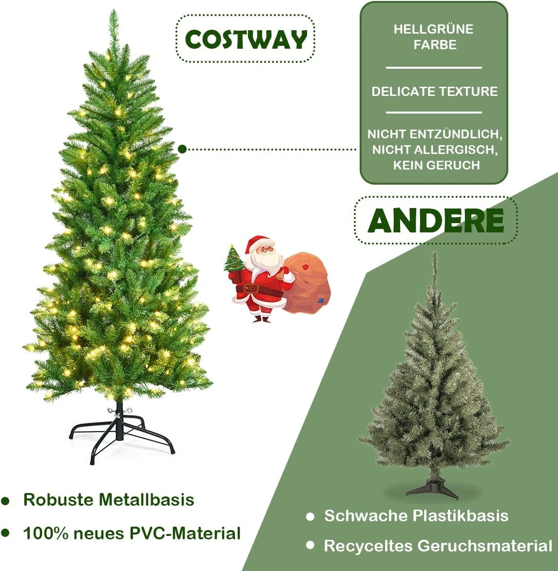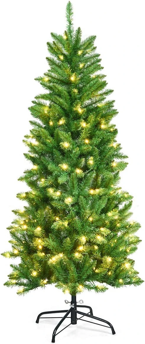 Weihnachten steht vor der Tür. Es ist an der Zeit, Ihr Haus mit einem perfekten Weihnachtsbaum zu schmücken. Mit seinem schlanken Bleistiftdesign wird dieser 150 cm große Baum nicht zu viel Platz einnehmen. Wo auch immer Sie ihn aufstellen, wie z.B. an der Tür, am Kamin, neben der Treppe, im Esszimmer und anderswo, er wird die perfekte Dekoration sein. In der Zwischenzeit werden seine 150 warmweißen LED-Lichter die festliche Atmosphäre erhöhen und Sie in Weihnachtsstimmung versetzen. Sorgfältig aus 100% neuem PVC hergestellt ist er geruchlos, nicht brennbar und hypoallergen, womit er ein sichereres Nutzungserlebnis bietet. Außerdem müssen Sie sich durch die klappbaren Abschnitte keine Sorgen machen, wie Sie diesen Baum aufbauen sollen. Das dauert nur wenige Minuten. Dank des robusten Metallständers steht der Weihnachtsbaum die ganze Saison über aufrecht. Bringen Sie ihn in Ihr Haus, erfüllen Sie es mit festlichem Jubel und genießen Sie ein fröhliches Fest.