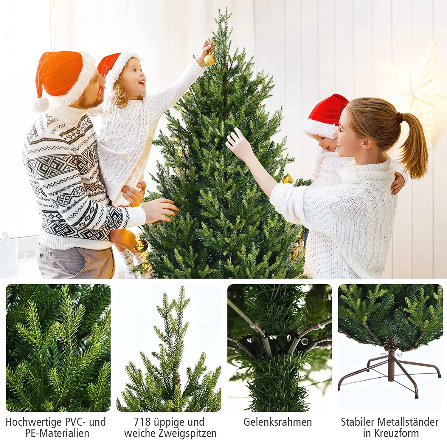 Unser 180 cm hoher künstlicher Weihnachtsbaum besteht aus PE und PVC, wodurch er ein besonders realistisches Aussehen bekommt. Abgesehen davon ist er feuerfest, ungiftig, nicht allergen, umweltfreundlich und sicher für Kinder und Haustiere. Der Metallsockel ist mit rutschfesten Untersetzern ausgestattet, die zudem noch den Boden vor Kratzern schützen. Da der Baum aus nur 3 Abschnitten besteht, kann er leicht auf- und abgebaut sowie gelagert werden. Er ist ein absoluter Blickfang auf Weihnachtsfeiern, Hochzeiten, Geburtstagen usw.!
