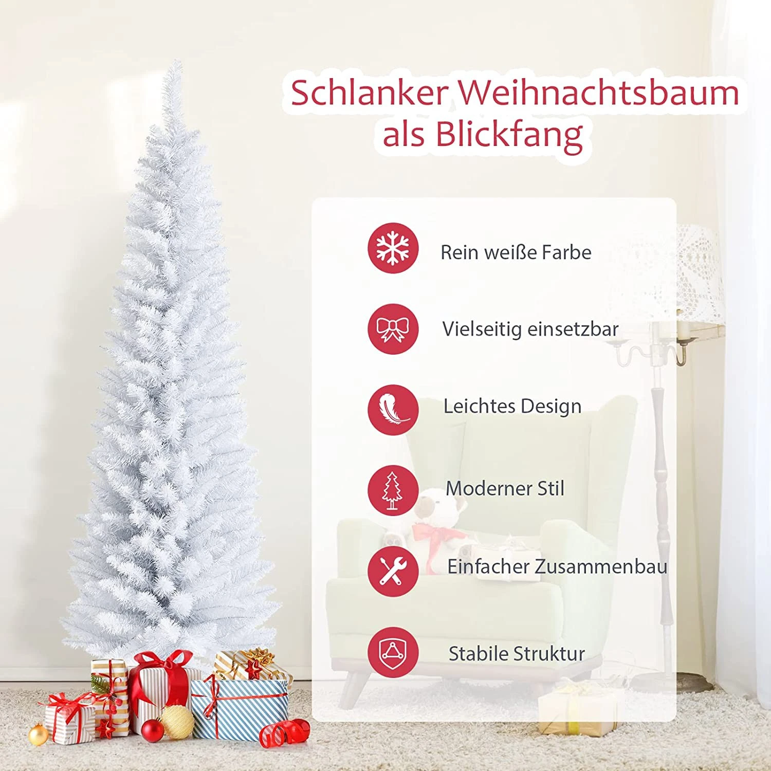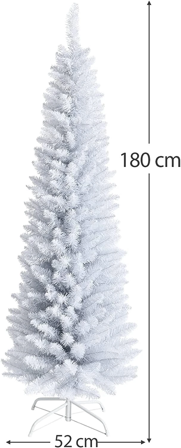Wir wünschen Ihnen eine friedliche und fröhliche Weihnachtszeit. Unser schlanker und weißer Weihnachtsbaum ist eine tolle Dekoration für dieses Zeit. Durch seine weiße Farbe ist er ein echter Blickfang. Der Baum hat 340 hochwertige PVC-Zweige, durch die er realistisch und üppig aussieht. Durch den robusten Metallständer steht er aufrecht und stabil. Bei Nichtgebrauch kann alles zusammengeklappt und in der Tasche verstaut werden. Außerdem eignet sich der Baum durch seine schlanke Form auch für kleine Räumlichkeiten. Durch seinen verschneiten Look versprüht er einen romantischen und winterlichen Charme.