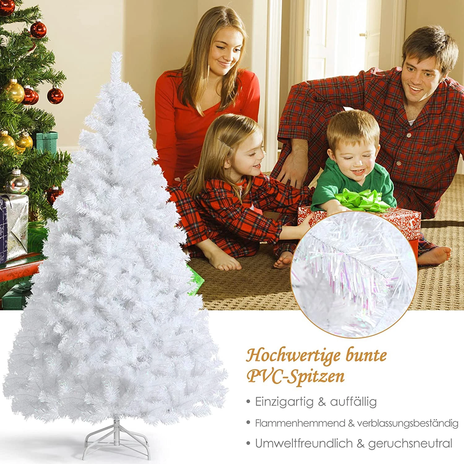 【Premium PVC & dichte Zweige】Der weiße Weihnachtsbaum besteht aus hochwertigem PVC und ist umweltfreundlich, feuerfest, farbefest und langlebig. Außerdem sorgen die 850 Zweige für ein dichtes und fluffiges Aussehen.