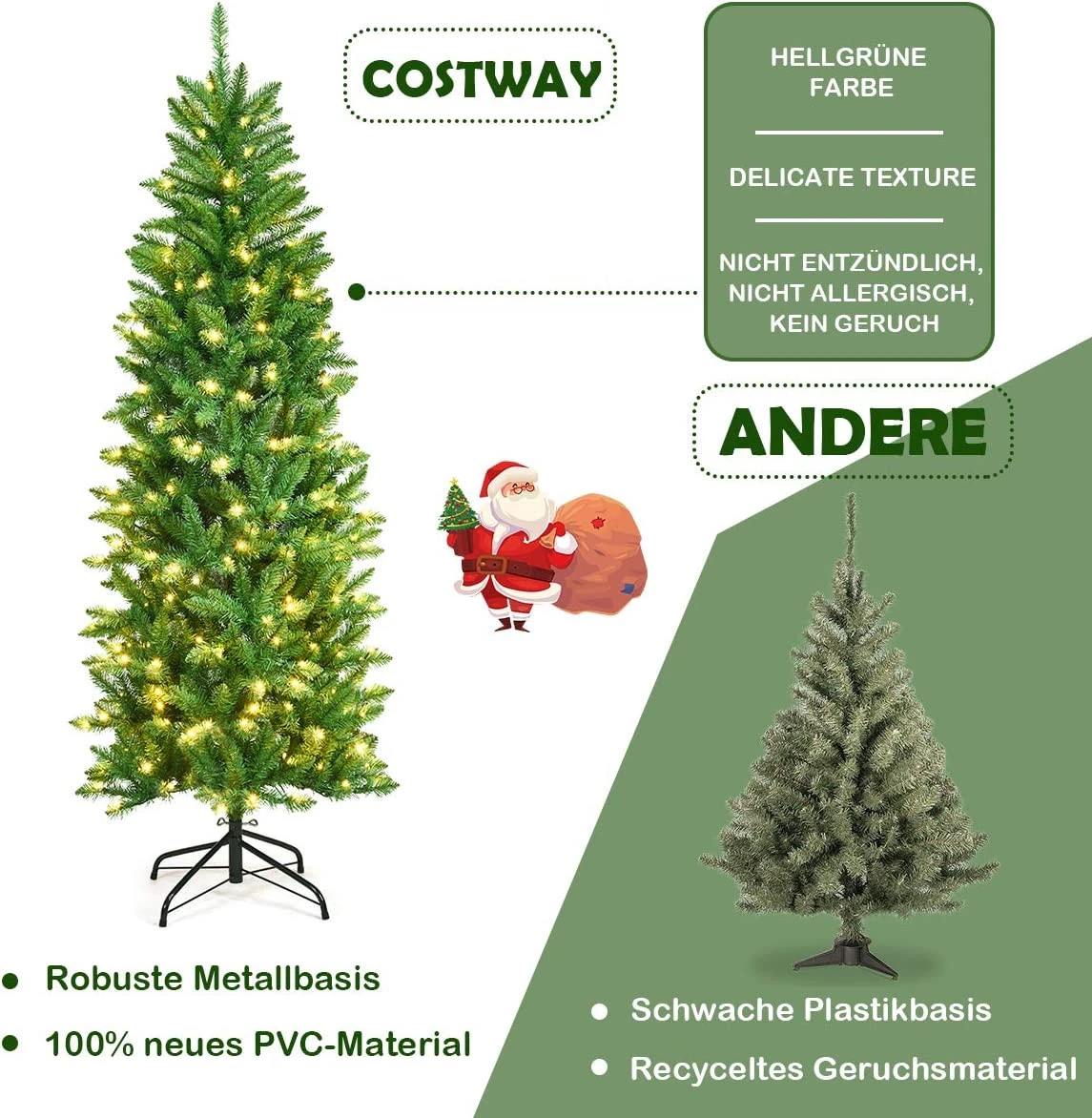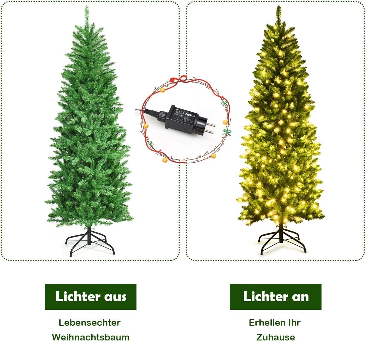 Glauben Sie ruhig, dass dieser Weihnachtsbaum Glück und allen in der bedeutungsvollen Weihnachtszeit Segen bringen wird. Er ist mit 250 warmweißen LED-Leuchten bestückt, die hellstrahlen. Sein schlankes Design wird nicht allzu viel Platz auf dem Boden einnehmen, und wo immer Sie ihn aufstellen, wie z.B. an der Tür, am Kamin, auf der Treppe, im Esszimmer usw., wird er die perfekte Dekoration sein. Während dessen bringt die grüne Farbe einen Hauch Lebendigkeit Zimmer. Mit den praktischen Scharnierabschnitten ist er in Minuten aufgebaut und wird mit dem mitgelieferten stabilen Metallständer in aufrechter Position gehalten. Schalten Sie die hellen Lichter ein, um die Weihnachtsstimmung zu genießen. Der Baum ist aus 100% neuem PVC gefertigt, also ist Ihre Sicherheit gewährleistet.