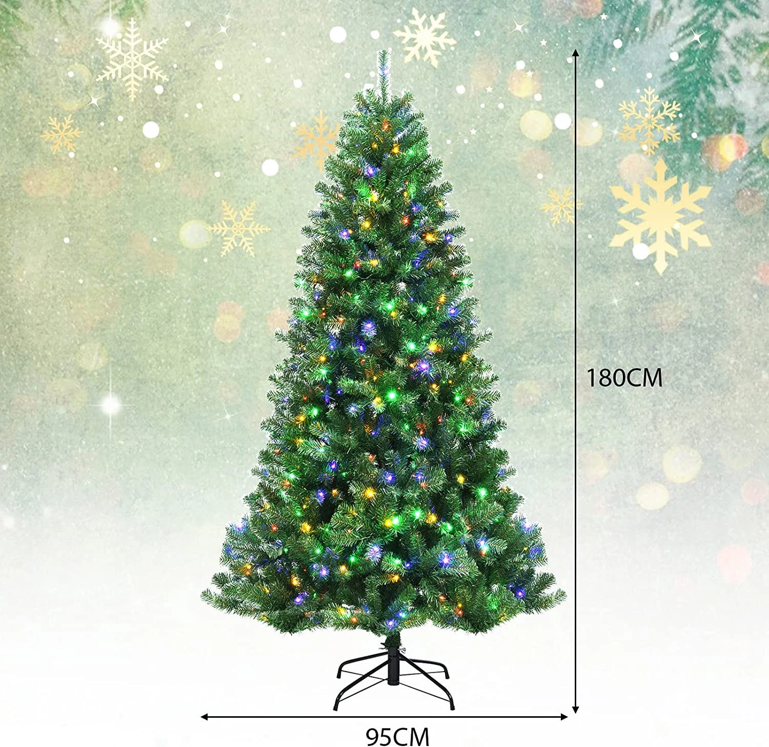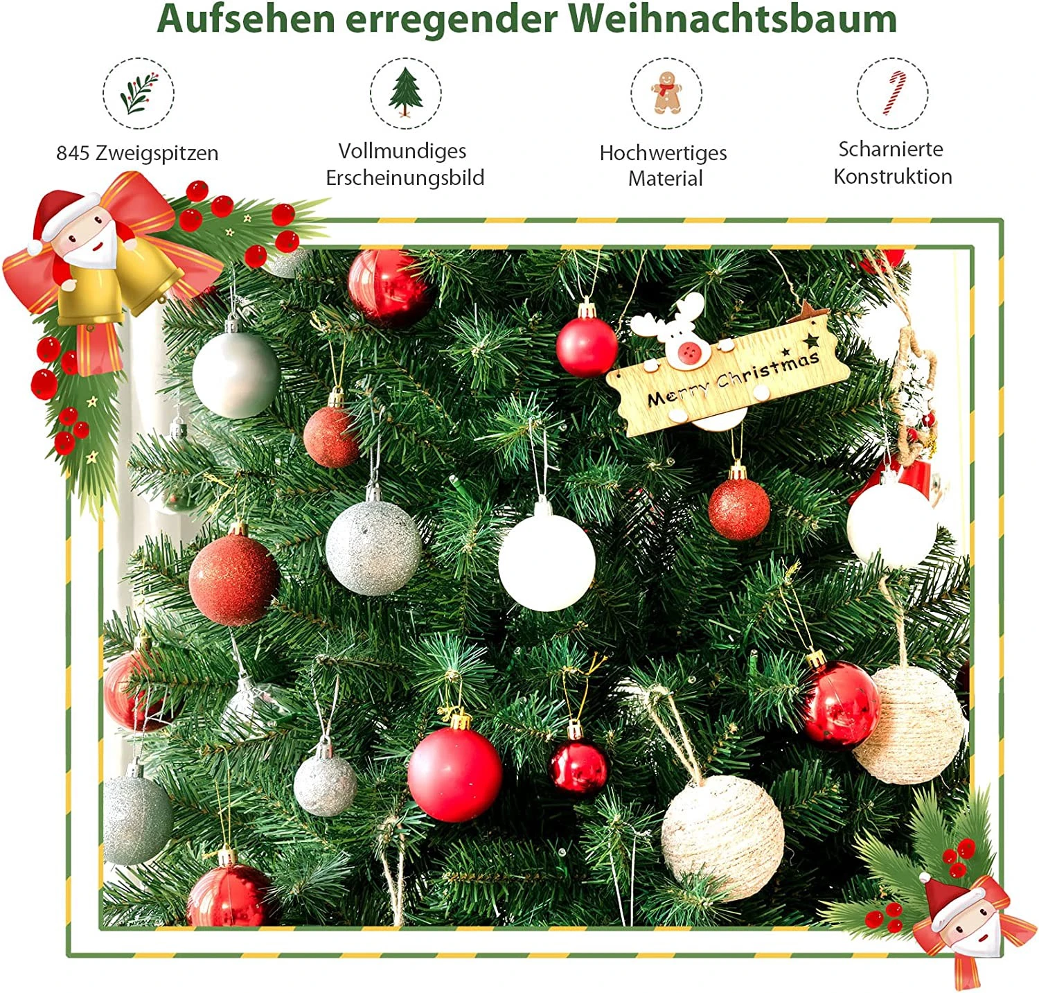 Es ist Zeit, die Weihnachtsdekoration auszupacken! Unser 180 cm hoher Baum ist eine tolle Ergänzung für die Party. Durch seine 845 Zweige wirkt er besonders dicht und üppig. Außerdem besteht er aus zu 100% neuem PVC und ist dadurch geruchlos, feuerfest und sogar recycelbar. Sie können ihn mit vielen Ornamenten schmücken. Die 350 LED-Lichter leuchten in 4 Farben und in 9 verschiedenen Modi. Diese können Sie per Fernbedienung ganz leicht kontrollieren. Durch die klappbare Struktur ist der Aufbau einfach.