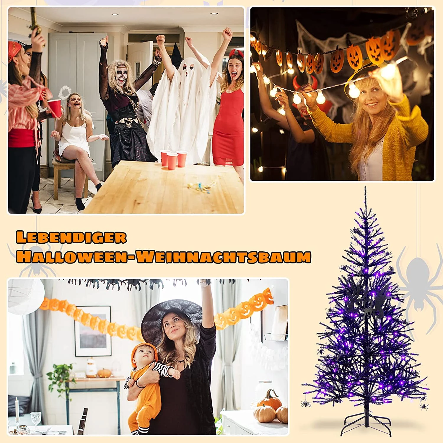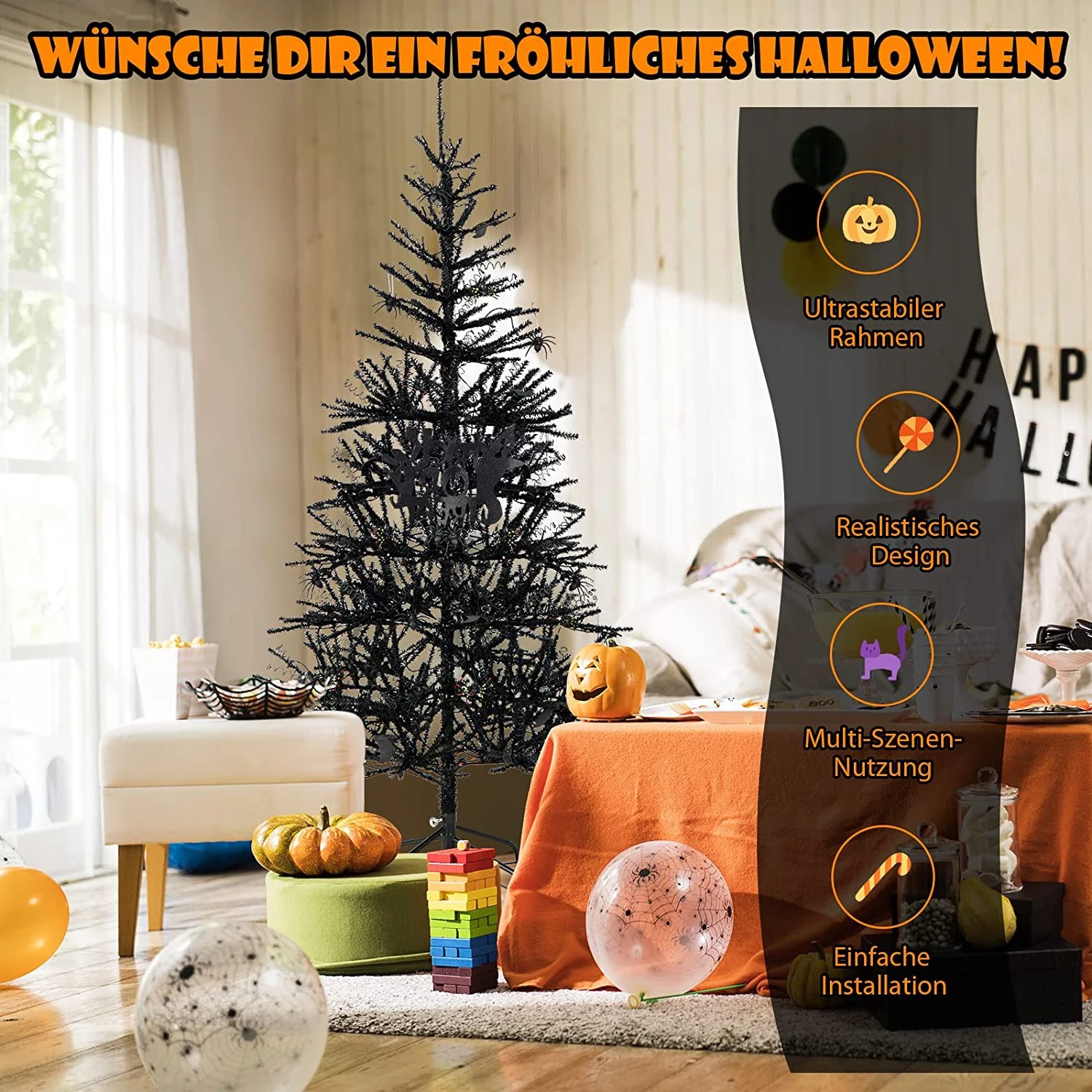 Genießen Sie ein aufregendes Halloween mit unserem schwarzen Kunstbaum! Der 183 cm hohe Dekorationsbaum verfügt über 791 PVC-Spitzen mit ausgezeichneter Licht- und Feuerbeständigkeit. Seine 250 LED-Leuchten leuchten lila, um eine Horror-Halloween-Stimmung hervorzuheben. Der vorbeleuchtete Dekorationsbaum ist in 3 Abschnitte unterteilt und lässt sich leicht auf- und abbauen und verstauen. Das aufklappbare Design spart Ihnen auch viel Zeit beim Einrichten. Sie müssen nur die mitgelieferten Handschuhe für eine bessere Form der Äste anziehen. Es gibt eine schwarze Geister-Hängekarte, 8 bunte Spinnen-Anhänger, 8 schwarze Spinnen-Anhänger und 8 Fledermaus-Anhänger in der Packung, die einen hübscheren Dekorationsbaum ermöglichen. Der Halloween-Baum wird von einem klappbaren Metallständer getragen und ist perfekt ausbalanciert, ohne den Boden zu zerkratzen. Außerdem ist er auch ideal für Weihnachten. Genießen Sie jetzt einen wunderschöne Feiertag mit Ihren Freunden!