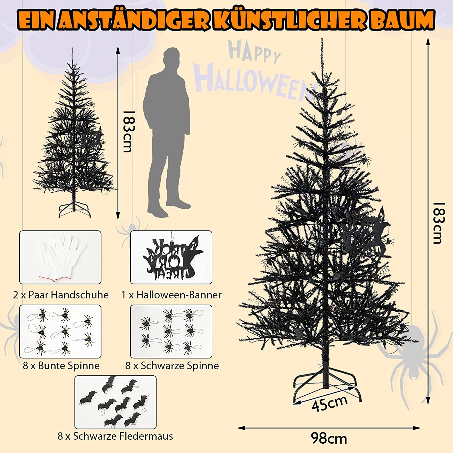 - Lieferumfang: 1 x Künstlicher Baum;2 x Handschuhe;1 x schwarze Geisterkarte zum Aufhängen;8 x Bunte Spinnenanhänger;8 x Schwarze Spinnenanhänger;8 x Fledermausanhänger;1 x Benutzerhandbuch