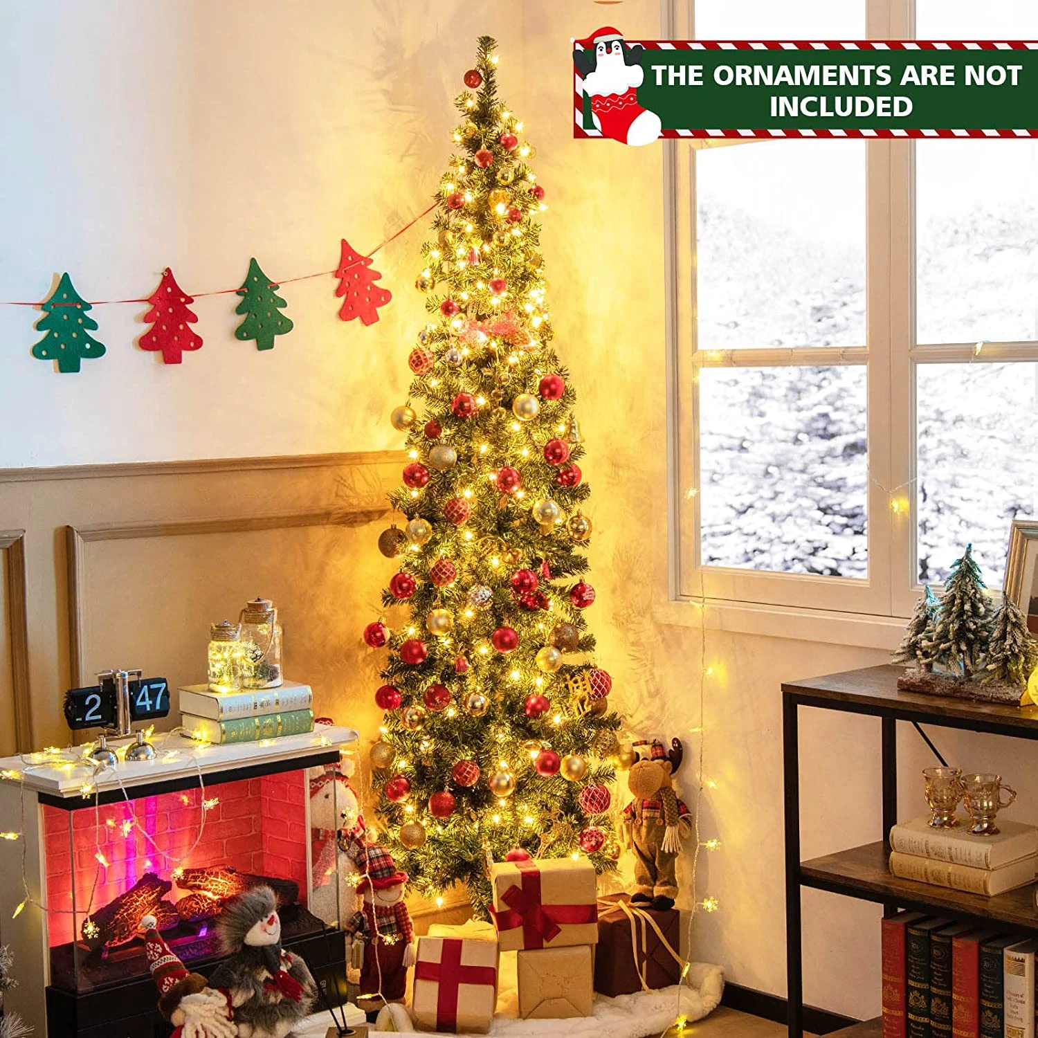 Möge der Glanz des Weihnachtsbaums Ihre Weihnachtstage mit Freude füllen! Unser 210 cm langer, beleuchteter Weihnachtsbaum nimmt eine schlanke Halbform an, die nicht viel Platz auf dem Boden einnehmen würde, während er ein volles und realistisches Erscheinungsbild bietet. Er eignet sich zum Platzieren in engen Ecken oder Bereichen mit begrenzter Stellfläche und verleiht Ihrem Zuhause mehr Originalität. Darüber hinaus ist der beleuchtete Weihnachtsbaum mit 150 warmweißen LED-Lichtern ausgestattet, die gleichmäßig über die Äste verteilt sind und in der Weihnachtsnacht helle Lichteffekte hinzufügen. Es gibt 450 dichte Zweigspitzen, um einen lebensechten künstlichen Weihnachtsbaum zu bilden, der das Aussehen eines echten Baums in hohem Maße imitiert. Und die Blätter bestehen aus 100% neuem PVC-Material, das nicht brennbar, rissfest und langlebig ist und eine lange Lebensdauer gewährleistet. Um die Aufbewahrung zu erleichtern, kann der Baum einfach in 3 Teile und einen faltbaren Metallständer zerlegt werden.