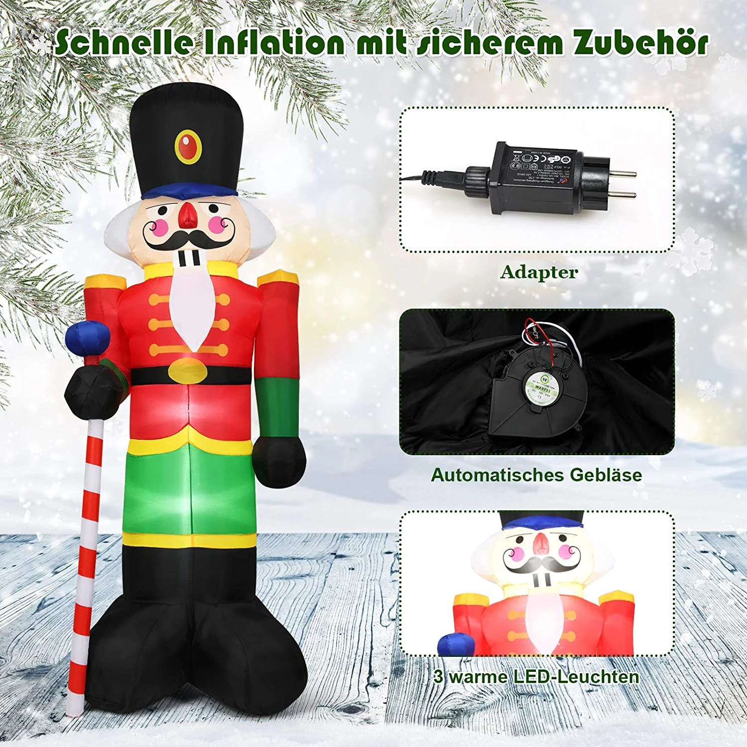 - Lieferumfang: 1 x Aufblasbarer Nussknacker-Soldat;1 x Gebläse;1 x Adapter;2 x Metallpfähle;2 x Seile;1 x Bedienungsanleitung