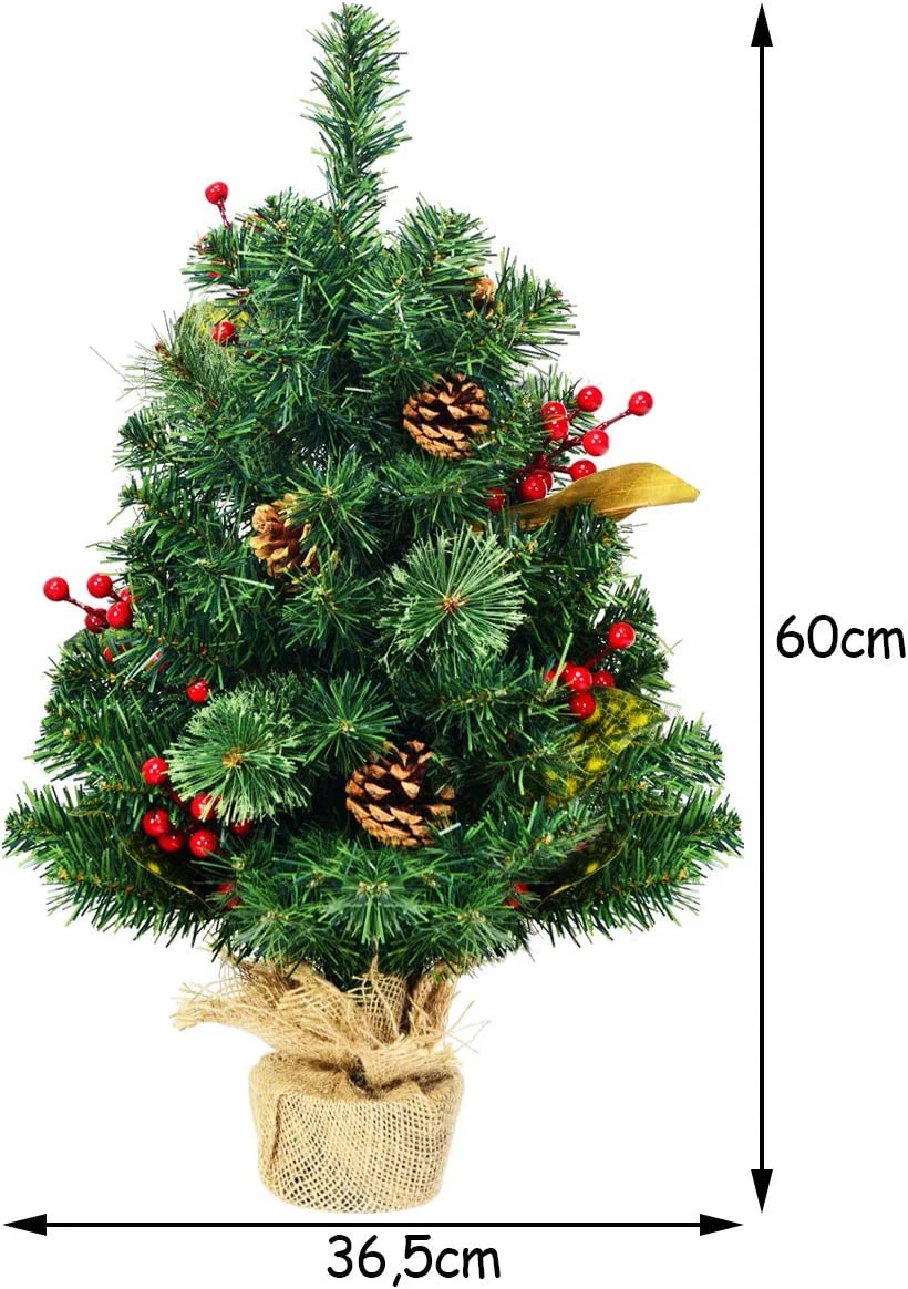 Suchen Sie nach ein paar Mini Weihnachtsbäumen als Ergänzung für Ihre Weihnachtsdekoration? Dieser künstliche miniatur- Weihnachtsbaum misst lediglich 60 cm und ist somit perfekt geeignet, um Ihren Raum, den Tisch, das Büro oder jeden anderen, Ort mit wenig Platz aufzuhellen. Entworfen in einer schlichten, grüne Farbe und reichhaltigen Beeren, Blättern und lebhaften Kiefernzapfen erweckt er das Gefühl eines echten Weihnachtsbaumes. Der klassische Weihnachtsbaum ist mit einer Zementbasis ausgestattet, die die allgemeine Stabilität garantiert. Es ist kein Aufbau vonnöten und alles, was Sie tun müssen, ist Ihre Lieblingsdekorationen am Baum aufzuhängen. Lassen Sie diesen Weihnachtsbaum etwas festliche Freude in Ihr Zuhause bringen!