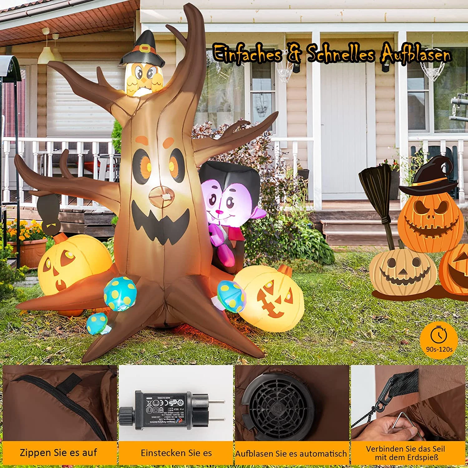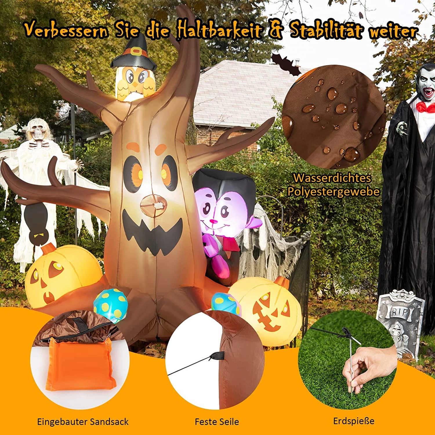 Halloween kommt bald. Sind Sie bereit oder suchen Sie noch nach einer einzigartigen Halloween-Deko? Unser aufblasbarer toter Baum kann Ihnen dabei helfen. Lebhafter Kürbis, Vampir, Eule und Pilze sind ein Symbol für Halloween und verbreiten eine fröhliche Atmosphäre in Ihrer Familie, Ihren Freunden und Ihrer Nachbarschaft. Außerdem sehen die leuchtenden LED-Lichter und funkelnden RGB-Lichter am Geisterbaum nachts großartig aus, was die Halloween-Party viel realistischer macht und die Aufmerksamkeit der Kinder auf den ersten Blick auf sich zieht. Wasserdichtes Polyestergewebe bietet langanhaltende Leistung für einen sorgenfreien Gebrauch. Die Erdspieße und der zusätzliche Sandsack verbessern auch seine Stabilität erheblich, ohne sich Sorgen machen zu müssen, dass er bei schlechtem Wetter weggeweht wird. Nach dem Entleeren können Sie ihn für den nächsten Gebrauch in einer Ecke aufbewahren. Es ist eine perfekte Halloween-Dekoration für Ihre Kinder, um einen wunderschönen Feiertag mit ihren Freunden zu genießen!