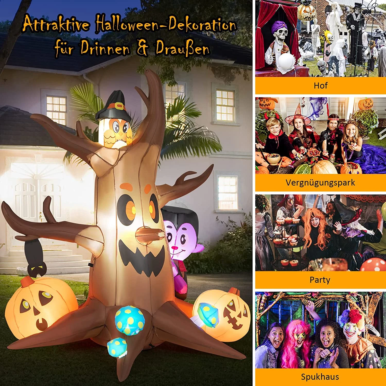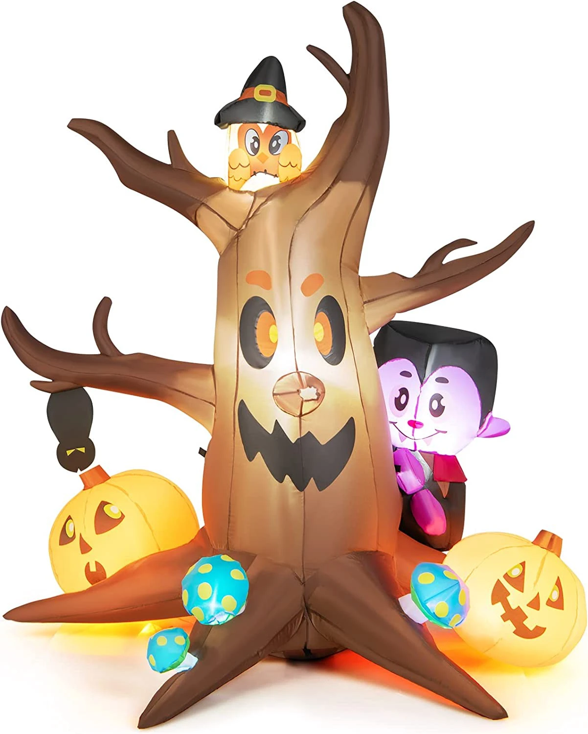 【Attraktive Halloween-Dekoration】 Dieser aufblasbare tote Baum besteht aus verschiedenen wesentlichen Elementen von Halloween, darunter Kürbis, Vampir, Eule und Pilze, was eine starke festliche Atmosphäre schafft und eine auffällige Ergänzung für jeden Ort im Freien ist. Außerdem macht es das lebendige und realistische Aussehen ideal für Kinder, um auf Süßigkeitenjagd zu gehen.