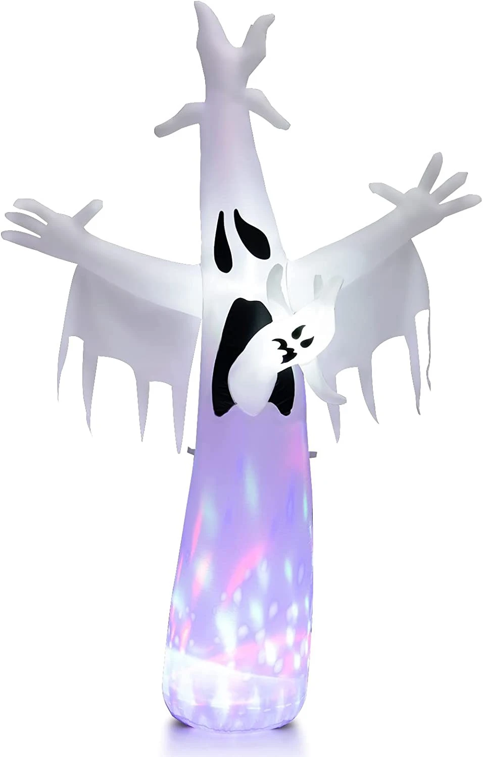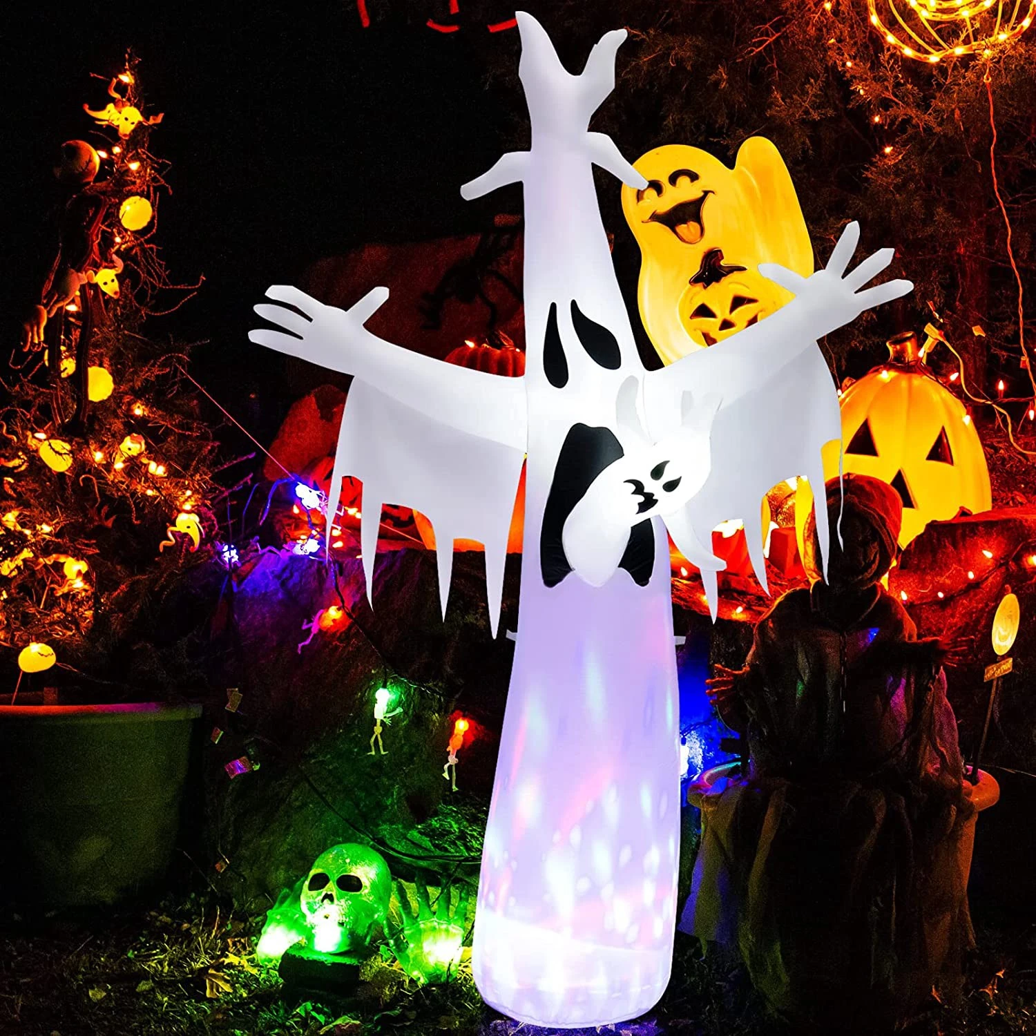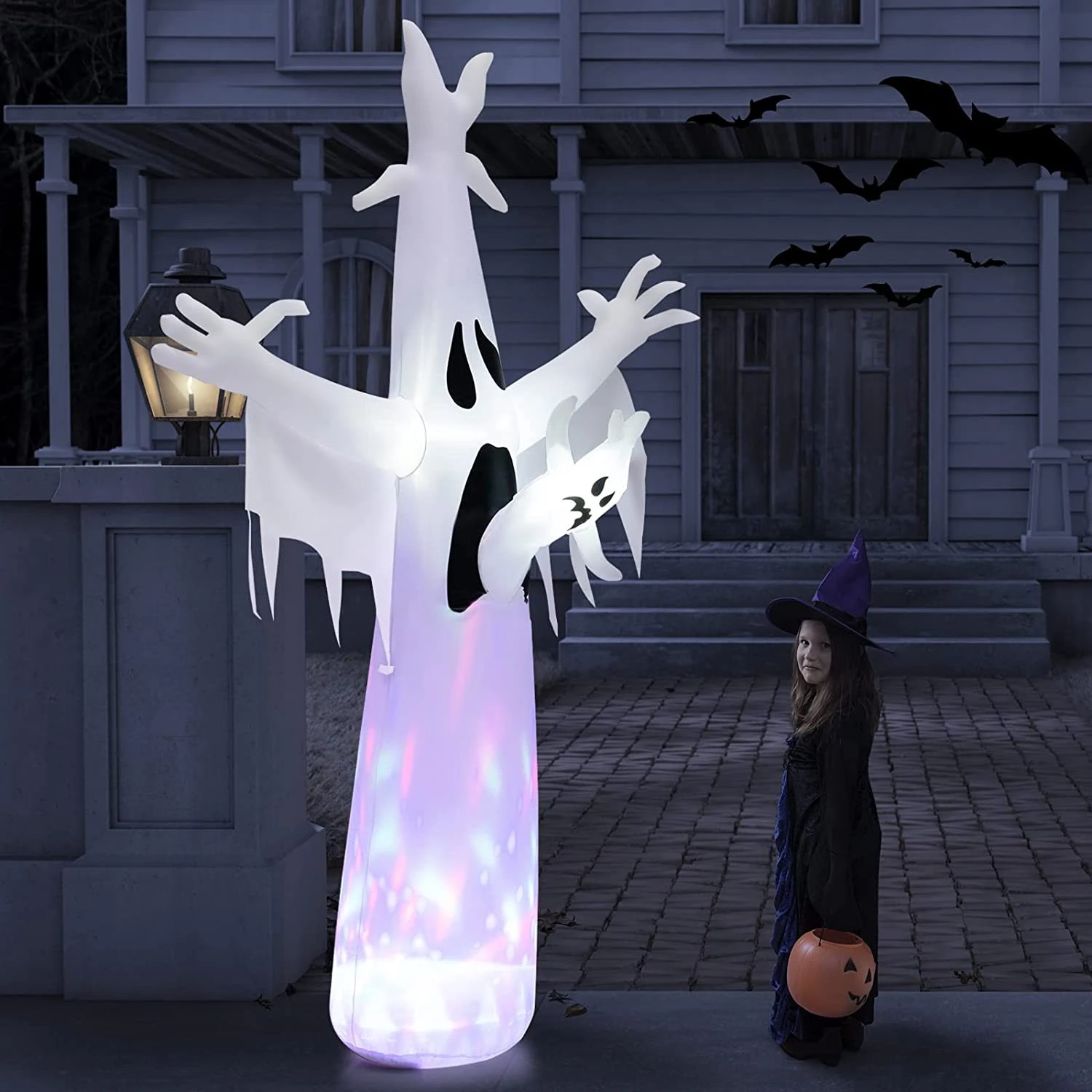 Das aufblasbare Gespenst ist speziell für die Halloween-Außendekoration gemacht, da das hochfeste Polyestermaterial wasserdicht und witterungsbeständig ist. Sie können es problemlos auf dem Rasen aufstellen, denn es gibt verschiedene Stabilisierungsmaßnahmen wie Sandsäcke, Windschutzseile sowie Bodenpfähle. Außerdem ist das aufgeblasene Gespenst 244 cm groß, was in der Nachbarschaft wirklich auffällt. Und das Design des kleinen Geistes, der aus dem Mund kommt, lässt die ganze Dekoration noch gruseliger aussehen. Außerdem ist das Gespenst mit einem einzigartigen rotierenden Unterlicht ausgestattet, das für eine magische Szene farbenfroh leuchtet. Daher wird dieses riesige aufblasbare Gespenst definitiv ein großer Hit!Technische Daten: