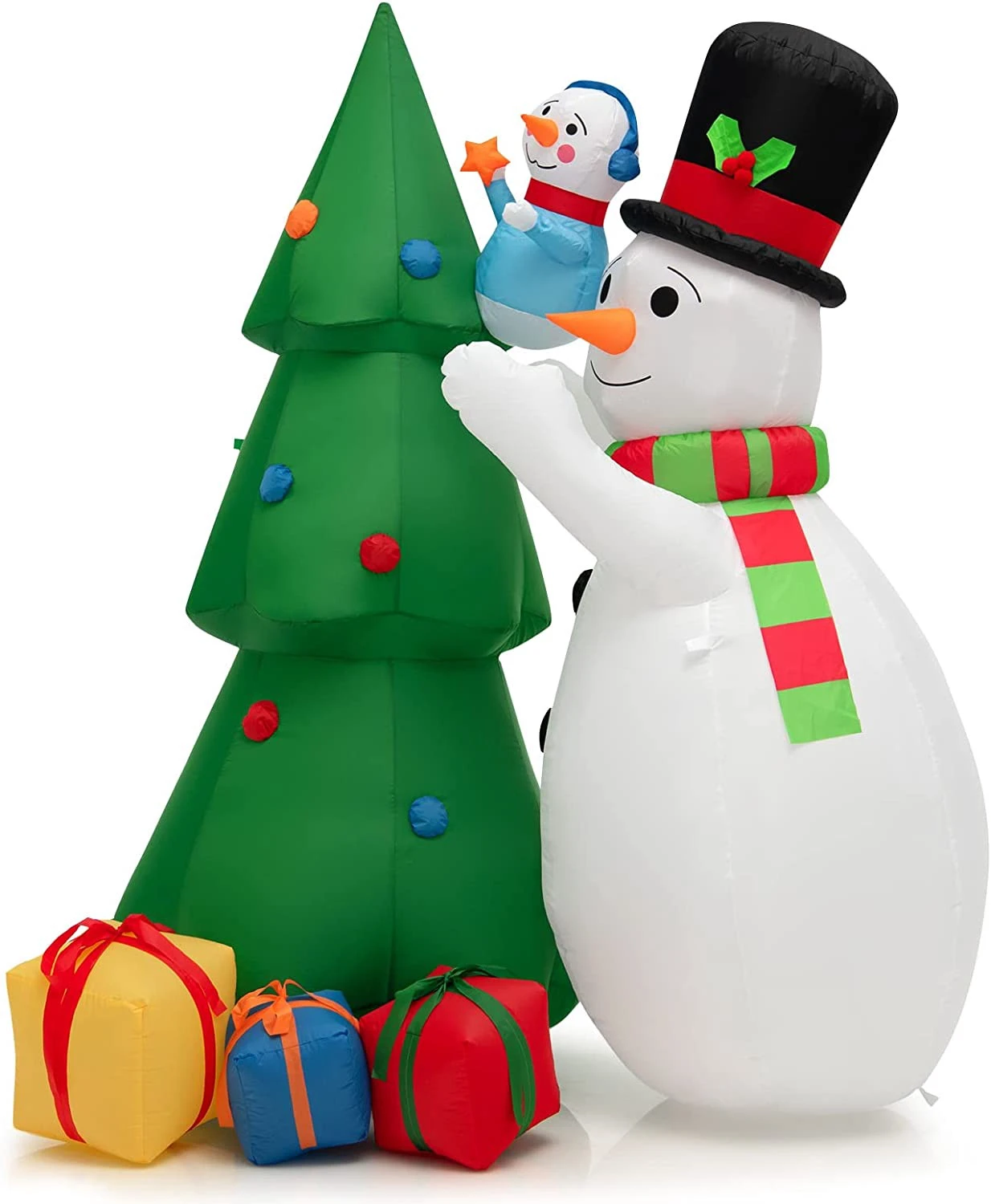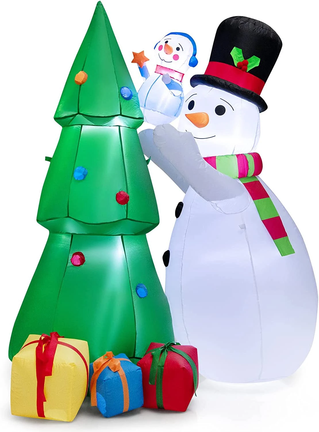 【Eingebaute LED-Leuchten】 Diese aufblasbare Dekoration ist abends mit dem atemberaubenden Lichteffekt der internen LED-Leuchten noch auffälliger. Der beleuchtete Weihnachtsbaum und zwei Schneemänner erhellen den Garten und ziehen die Aufmerksamkeit von Kindern und Ihren Gästen auf sich.