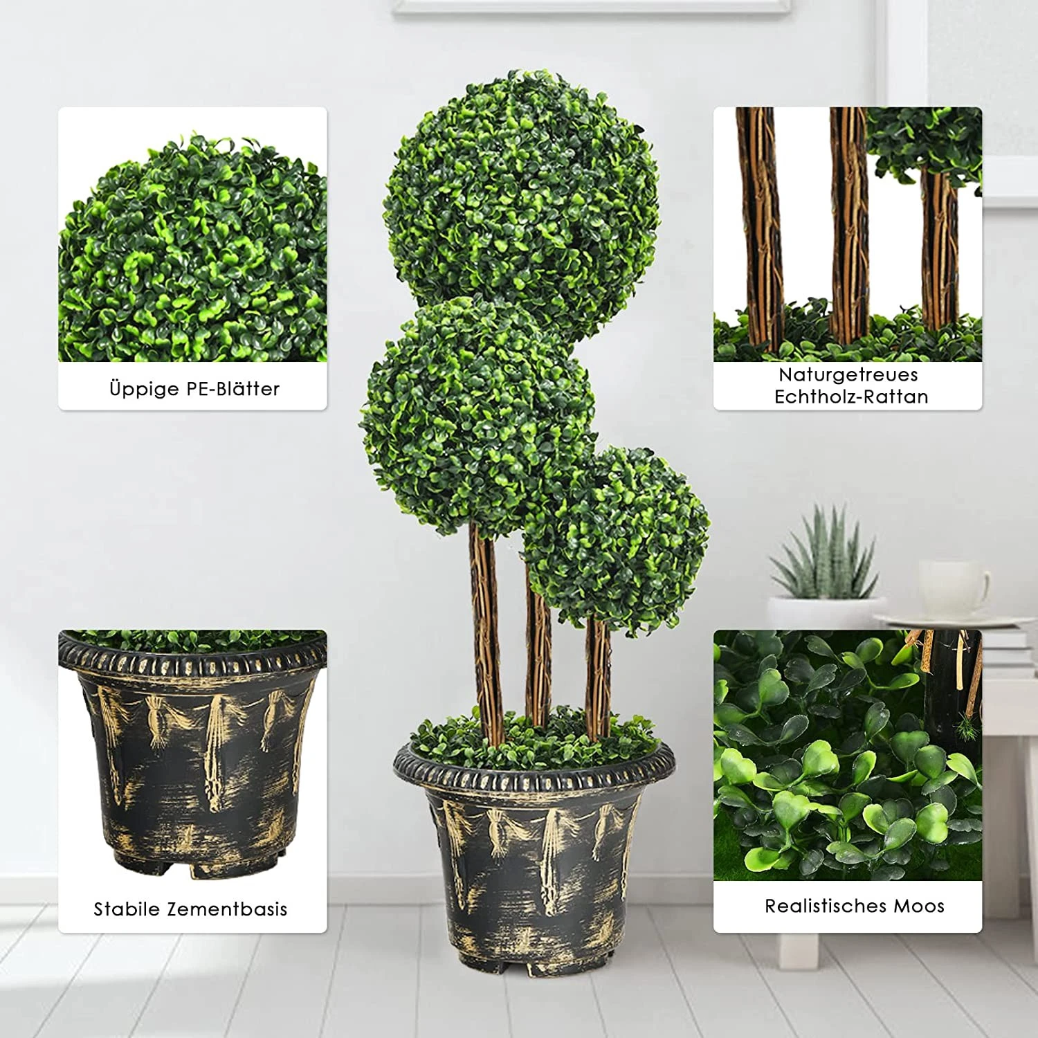 Durch die tiefgrünen Blätter und das Echtholz wirkt dieser 90 cm hohe künstliche Baum sehr realistisch. Sie werden ihn kaum von einem echten unterscheiden können. Durch seine PE-Blätter erstrahlt er ganzjährig in einem frischen Grün, wodurch er der Umgebung natürlichen Charme verleiht. Um die Qualität brauchen Sie sich keine Sorgen machen. Das PE ist ungiftig und geruchlos. Um die Gesamtstabilität zu gewährleisten, ist der Topf zudem mit Zement gefüllt. Er ist eine perfekte Dekoration für Innenbereiche wie Büros oder Außenbereiche wie Balkone. Er wird Ihnen alle Wünsche erfüllen.