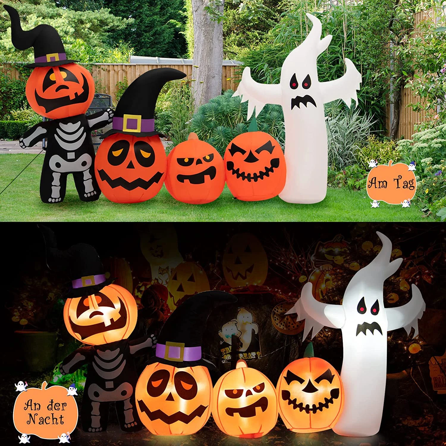 ????【Beleuchtetes Design für die Halloween-Nacht】 Die aufblasbaren Kürbisse und Geister sehen nachts lebendiger aus, da ihre Gesichtsausdrücke durch die internen LED-Lichter beleuchtet werden. Und das gespenstische weiße Licht schafft eine unheimliche Atmosphäre, die perfekt für die Halloween-Party und Süßes oder Saures-Aktivitäten ist.