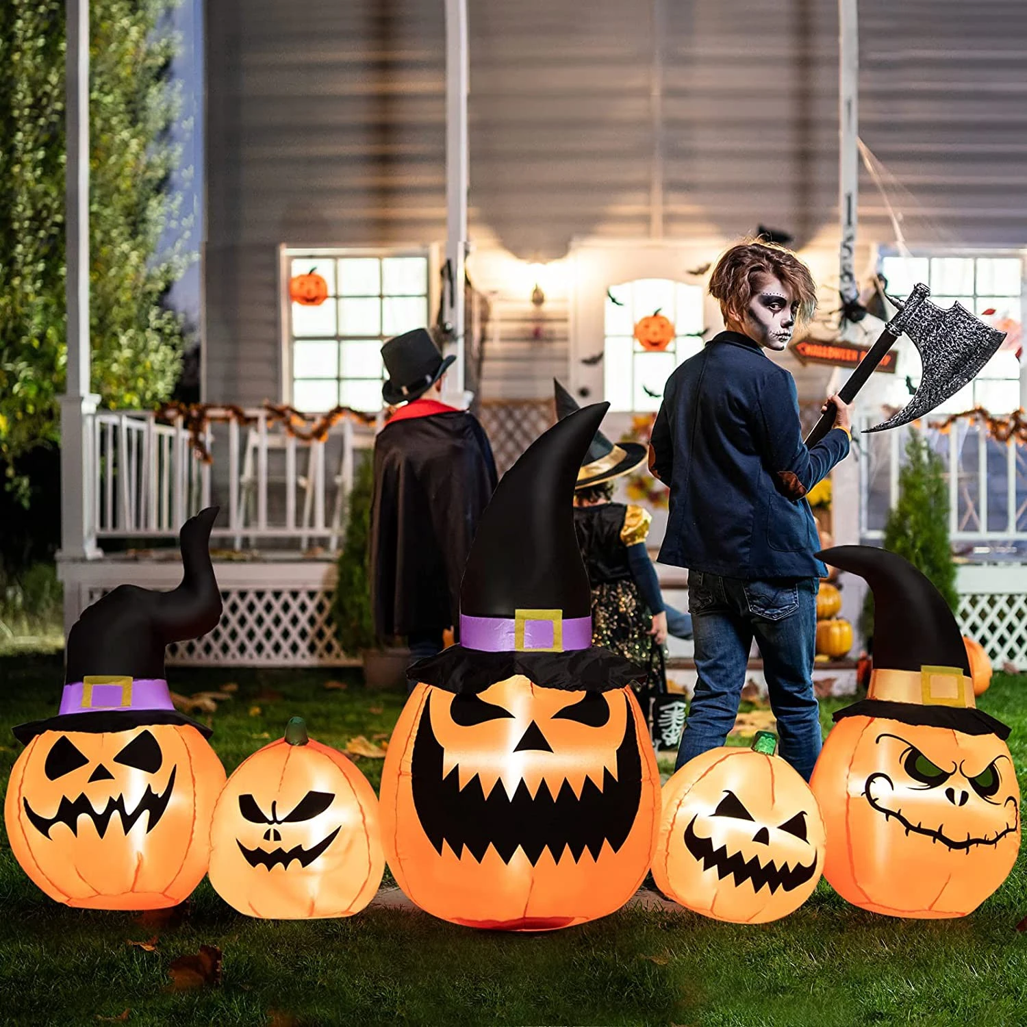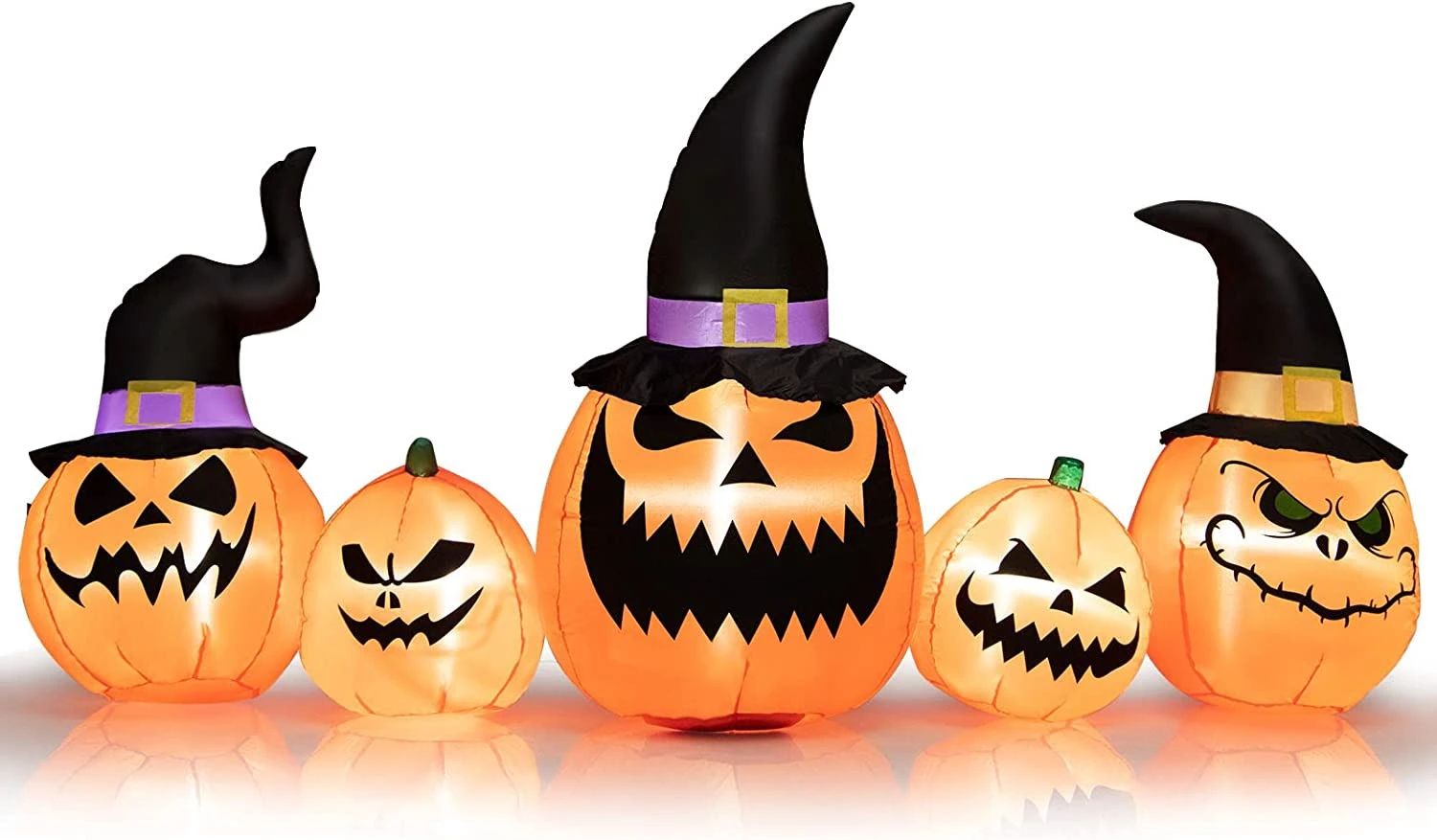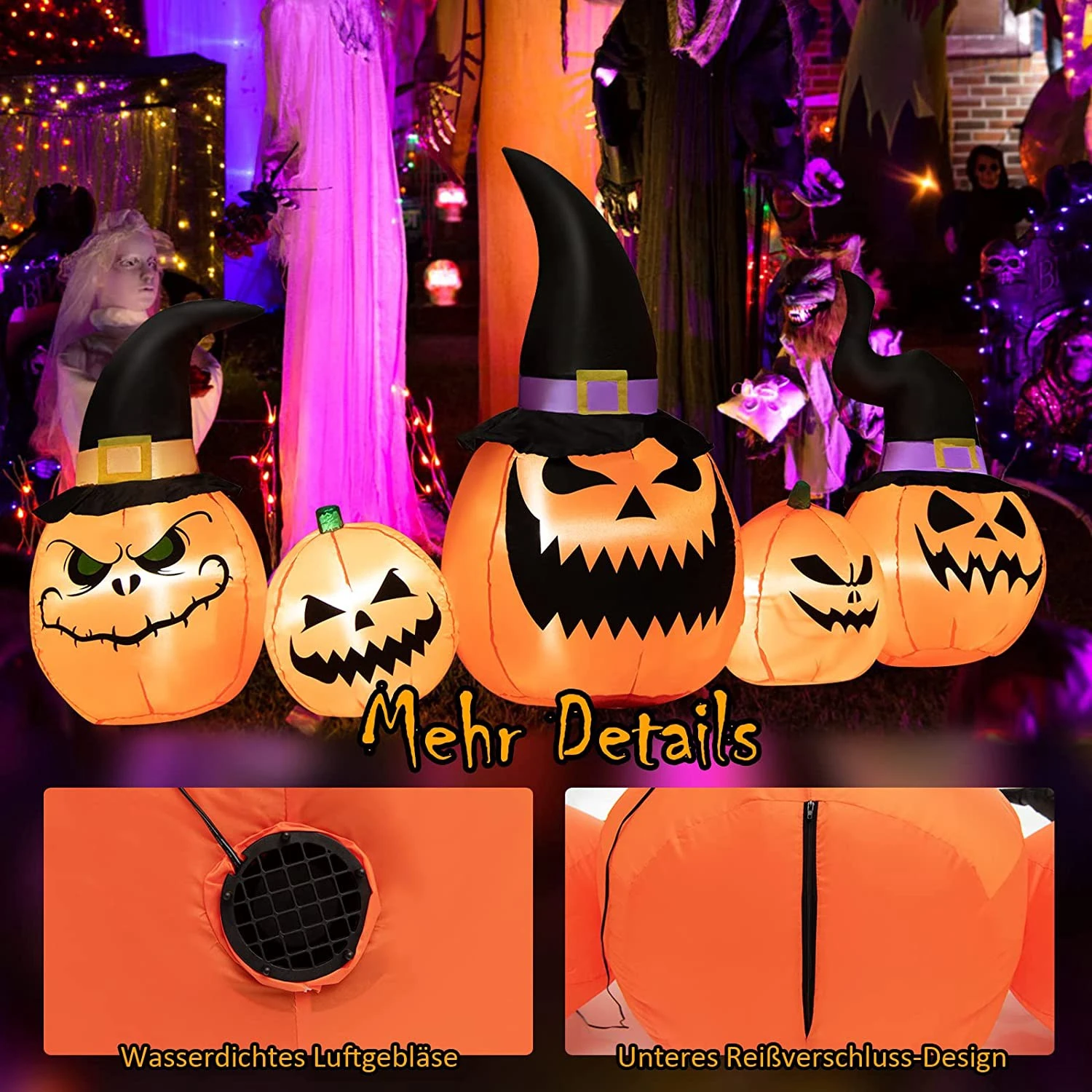【Kürbisfamilie für Halloween】 Diese 245 cm lange aufblasbare Halloween-Deko ist eine Kombination aus 5 Kürbissen in verschiedenen Größen und mit unterschiedlichen Ausdrucksformen. Einige lachen herzhaft, während andere ein böses Grinsen präsentieren. Außerdem fügen die spitzen Zaubererhüte ein Gefühl von Mysterium und Magie hinzu und machen die Kürbiskombination hübsch und attraktiv.