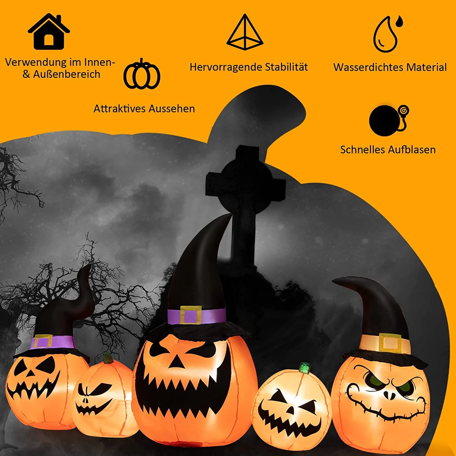 Stört es Sie, Halloween-Mottopartys zu dekorieren? Unsere aufblasbare Kürbisfamilie ist eine gute Lösung. Schwarz und Orange sind die internationalen Farben von Halloween, und die Kürbislaterne ist die klassischste Halloween-Dekoration. Drei große Kürbisse mit Zaubererhüten und zwei kleinere Kürbisse schaffen eine entzückende Gartendekoration voller Halloween-Atmosphäre. Die angemessene Größe macht die aufblasbare Kürbis-Kombination zu einer perfekten Dekoration für drinnen und draußen. Sobald sie an eine Steckdose angeschlossen ist, leuchtet sie auf und bläst sich automatisch innerhalb von 1 Minute auf. Dann können Sie sie mit Erdspießen und Halteseilen befestigen.