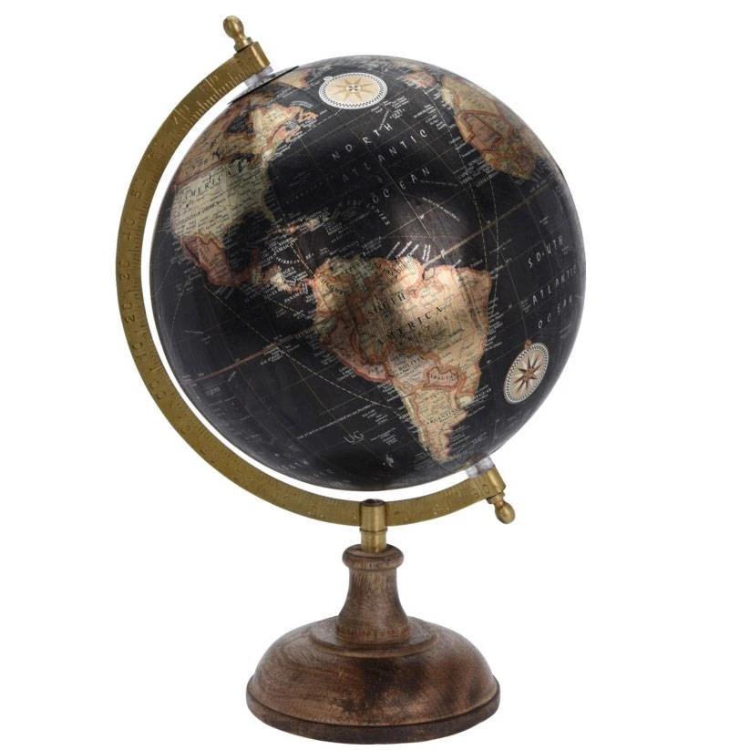 Der dekorative Globus METALIC ist ein Produkt, das Liebhaber des Industrie- und Vintage-Stils begeistern wird. Dieses Accessoire aus exotischem Mangoholz in einem dunklen, schwarzen und goldenen Farbton zieht mit seiner außergewöhnlichen Form alle Blicke auf sich. Eine Dekoration in Form eines stilisierten Globus kann leicht zu einem charakteristischen Hauptelement des Dekors werden. Aus diesem Grund ist es eine gute Idee, es auf einem Tisch oder Schreibtisch oder auf einem Bücherregal auszustellen.