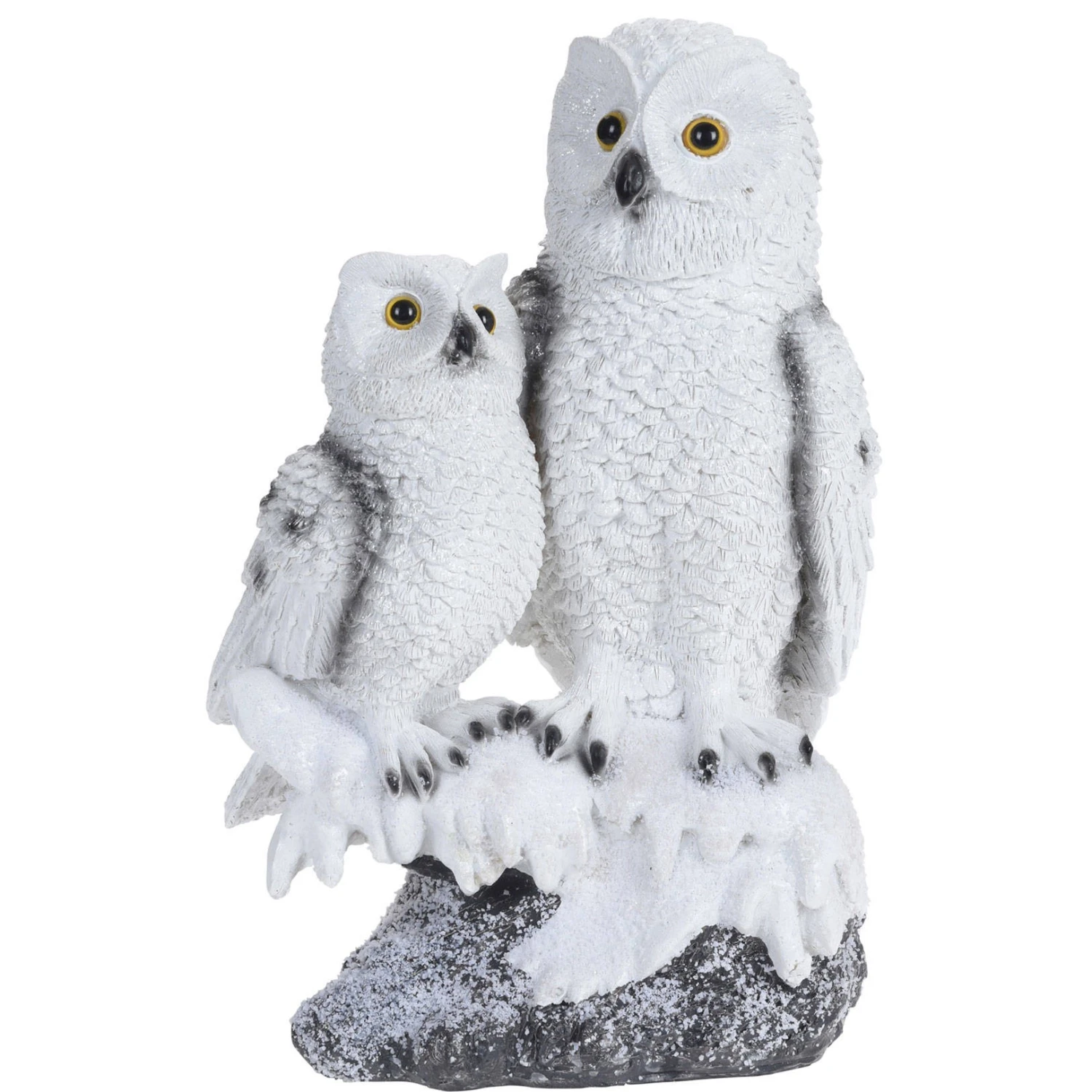 Eine Figur aus der Home Styling-Kollektion zeigt weiße Eulen, die auf einem Kofferraum sitzen. Das Produkt besteht aus hochwertigem Kunststoff, wodurch das Ornament jahrelang Freude an den Augen hat. Es ist erwähnenswert, dass graue Verfärbungen die Authentizität verleihen und sorgfältig gearbeitete Details die Eulenfigur begeistern.