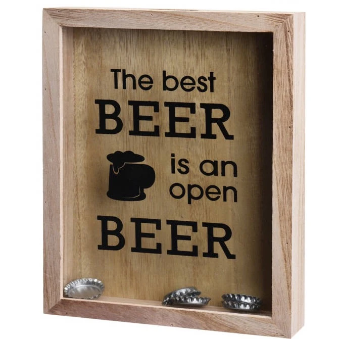 Eine hölzerne Weinkorkbox sieht gut aus, wenn sie an der Wand der Küche oder des Wohnzimmers hängt. Machen Sie weiter, Sie können es auch auf einen Schrank oder Schreibtisch stellen. Der Holzrahmen wird durch ein Glas schnell ergänzt. In der Mitte befindet sich die Aufschrift „Jede leere Flasche ist voller Liebe“. Dieses unterhaltsame Passwort wird Ihre Stimmung an schlimmeren Tagen definitiv verbessern. Und die universelle Farbe des Holzes passt in jede Inneneinrichtung.