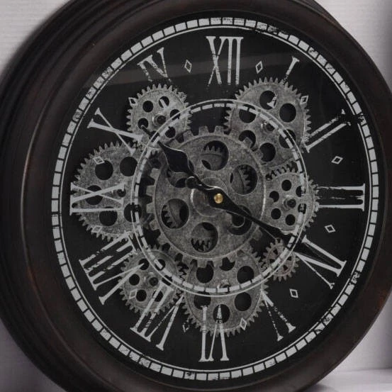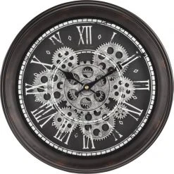 Metalluhr mit klarem Zifferblatt mit römischen Ziffern und einem markanten dekorativen Mechanismus – Zahnräder. Vintage-Styling – Reiben auf Farbe. D und glamourös, passt zu allen Innenräumen, wie Wohnzimmer, Küche oder Flur.