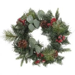 Darüber hinaus kann das Ornament ein Weihnachtsrohform für den Tisch sein. Der Durchmesser von 30 cm bietet eine natürliche Dekoration des Tisches für ein Heiligabendessen oder eine andere Mahlzeit in einem Kreis von Lieben. Es besteht aus Material, das wie ein echter Weihnachtsbaum aussieht. Es schafft ein klassisches Winterdesign, das eine angenehme, festliche Atmosphäre schafft. Die Dekoration von winzigen Zapfen und Hakenrowan ist eine einzigartige Ergänzung.