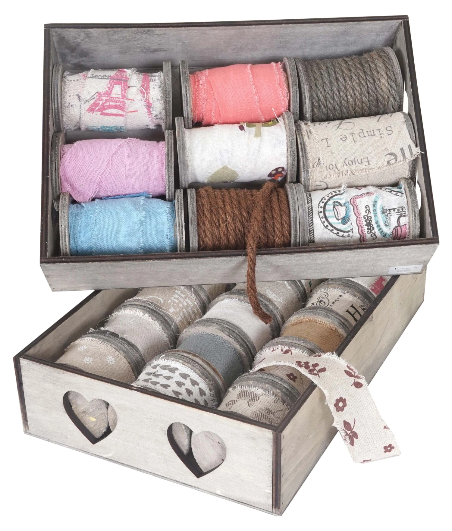 - Lieferumfang: 2x Holzbox, 27x Rollen mit Band