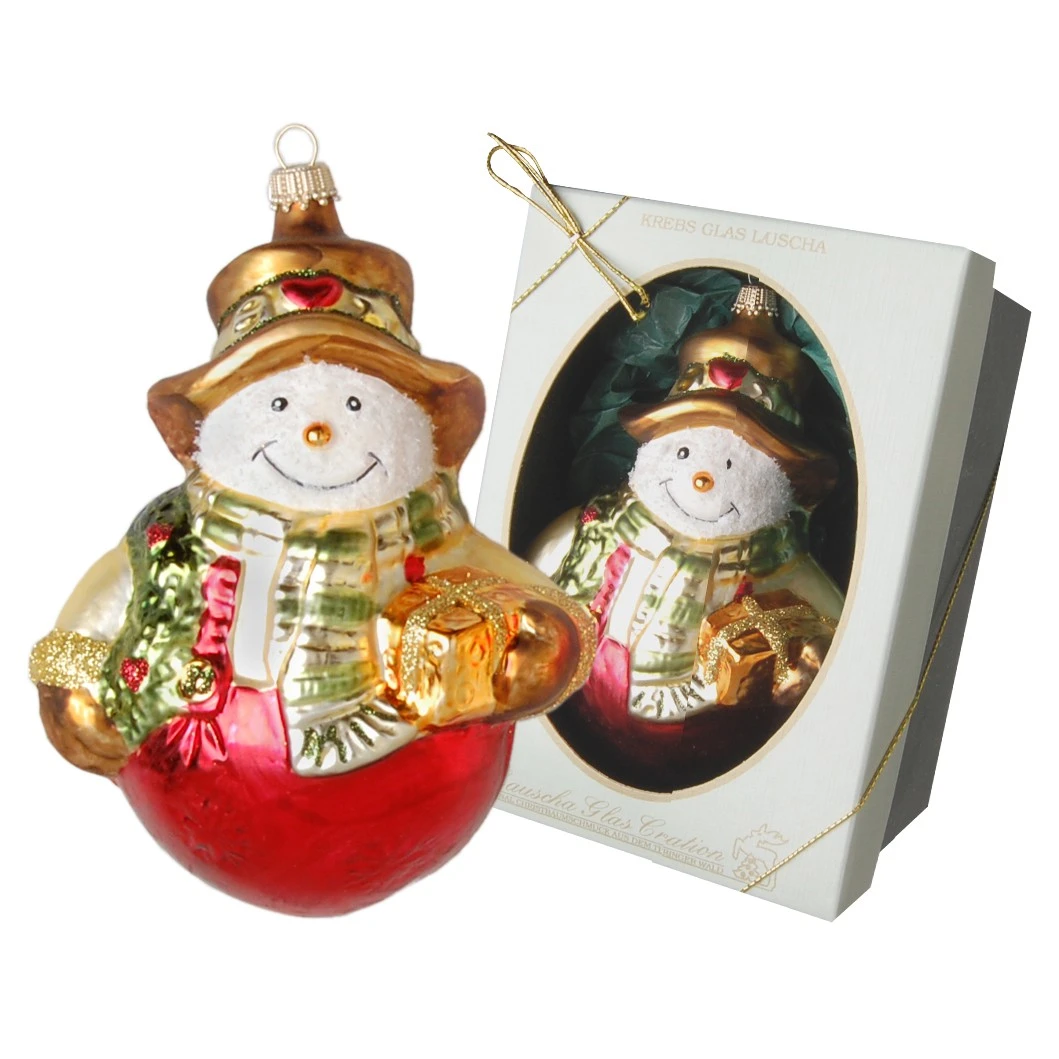 - Lieferumfang: Multicolor 13cm Schneemann mit Schal und Geschenken, Glasornament, mundgeblasen und handdekoriert (1)