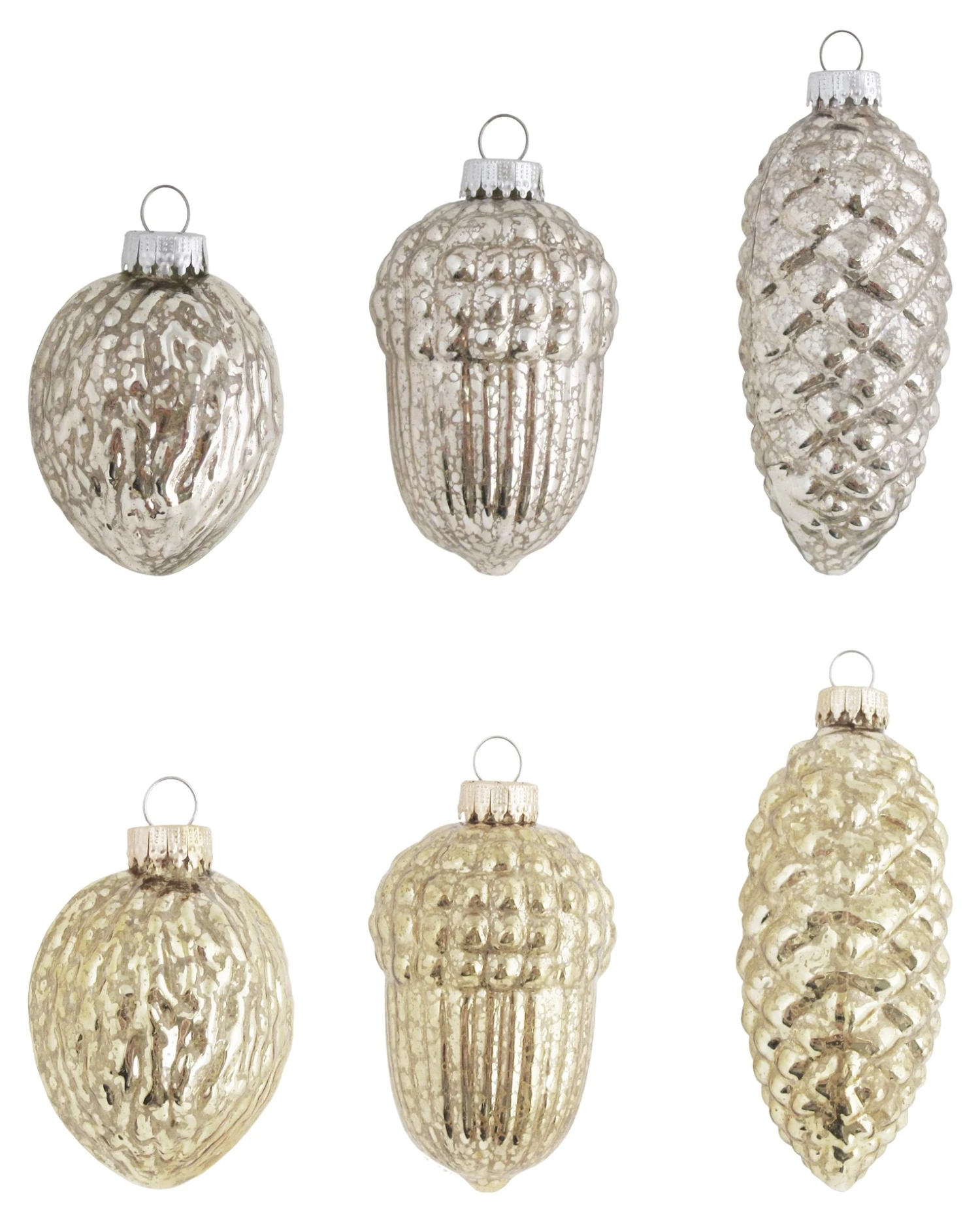 - Lieferumfang: Silber/Gold 6-10cm Zapfen/Eichel/Walnuss-Sortiment Mercury-Glas, 9-fach, mundgeblasen, handdekoriert
