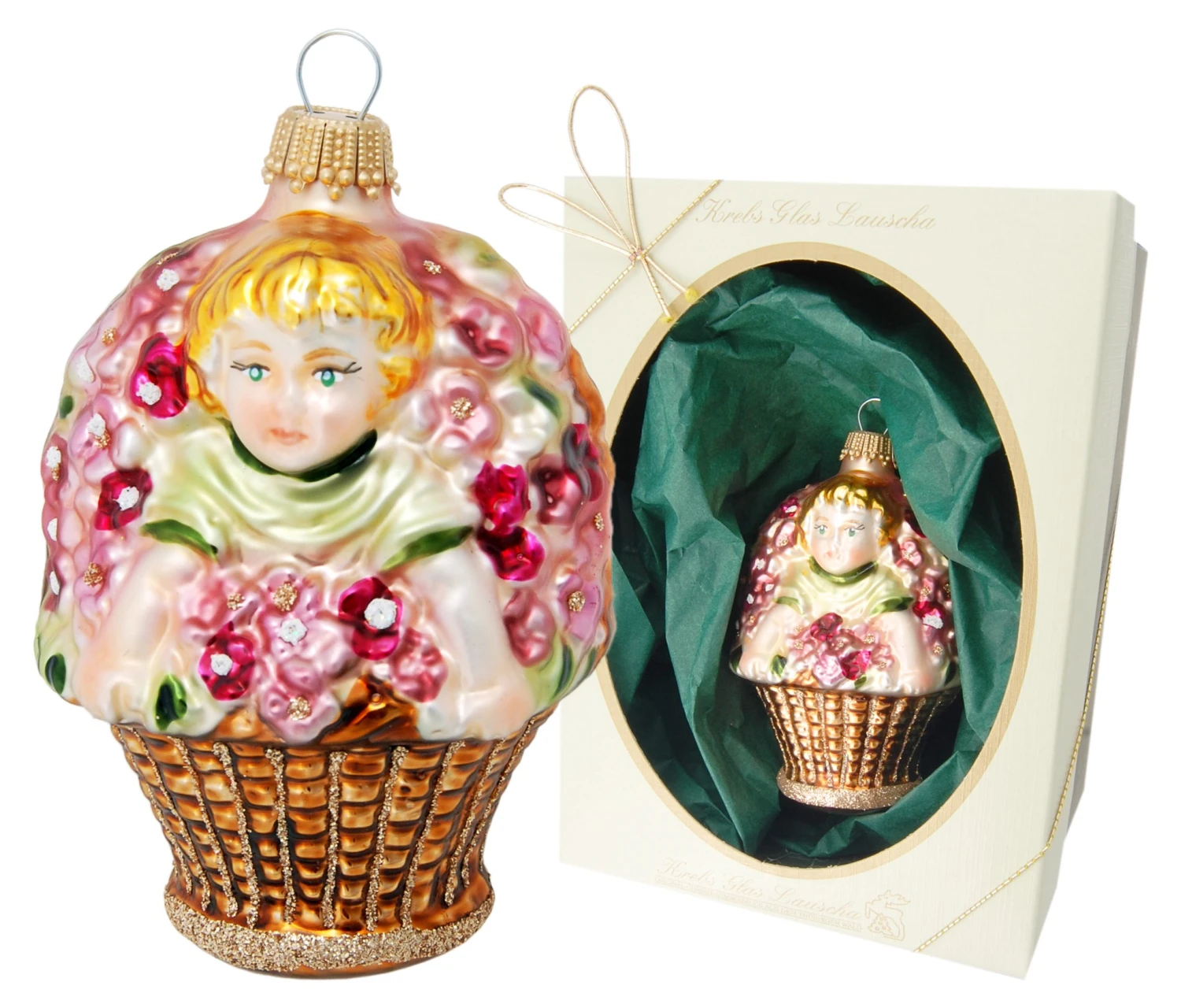 - Lieferumfang: Multicolor 9cm Biedermeier Kind im Korb mit mehrfarbigem Dekor, Glasornament, mundgeblasen und aufwendig handdekoriert (1)