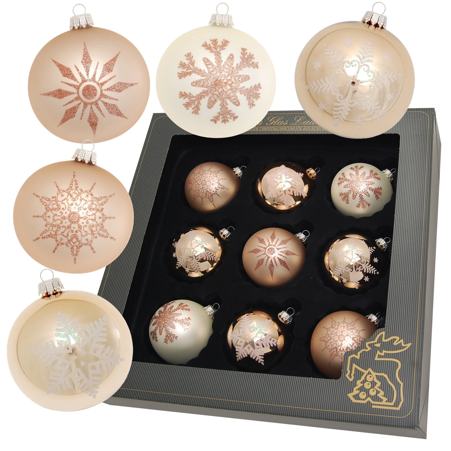 - Lieferumfang: Beige/Cappuccino 8cm Glaskugelsortiment 9-fach, mundgeblasen, handbemalt
