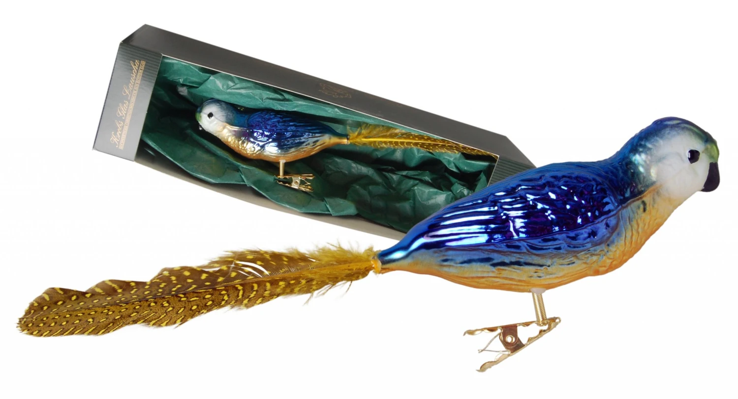 - Lieferumfang: Fantasiefarbig blau dekorierter 11cm Papagei aus Glas auf Clip mit 6cm Federschwanz mundgeblasen und aufwendig handdekoriert