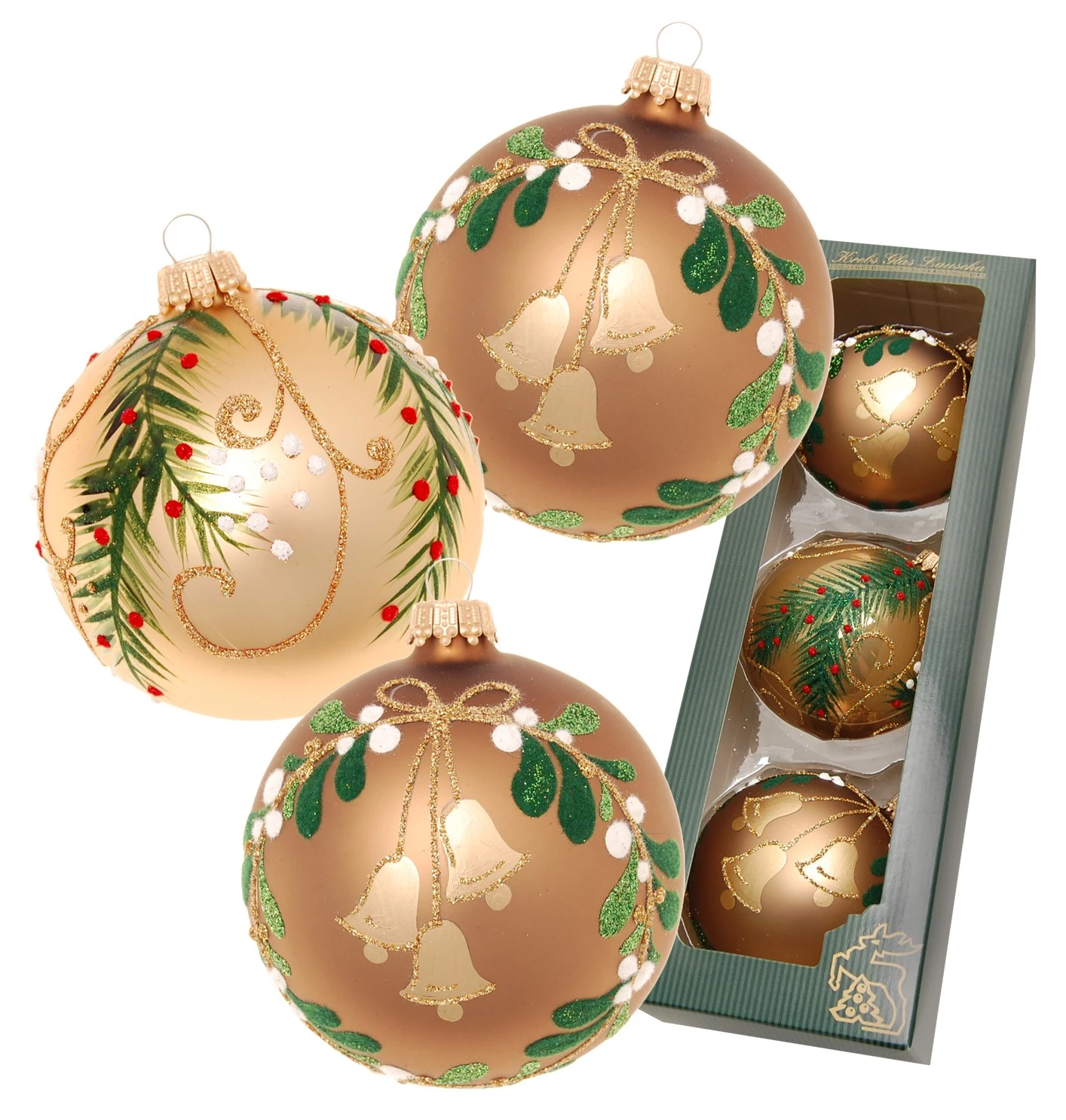 - Lieferumfang: Cappuccinofarbig matt 8cm Glaskugelsortiment 3-fach, mundgeblasen, handbemalt