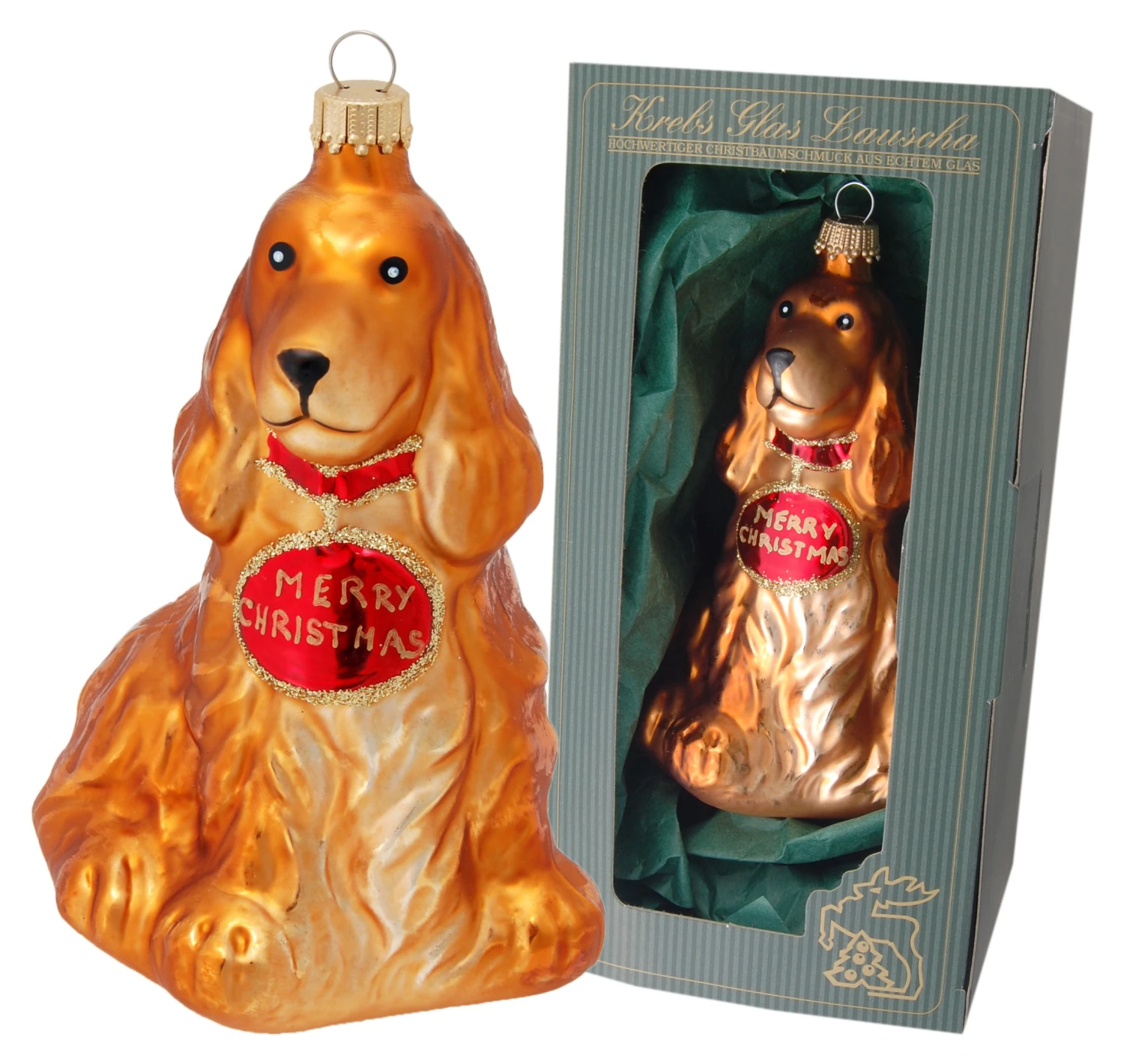 - Lieferumfang: Cocker Spaniel 13cm mit Schild Merry Christmas, Glasornament, mundgeblasen, handbemalt (1)