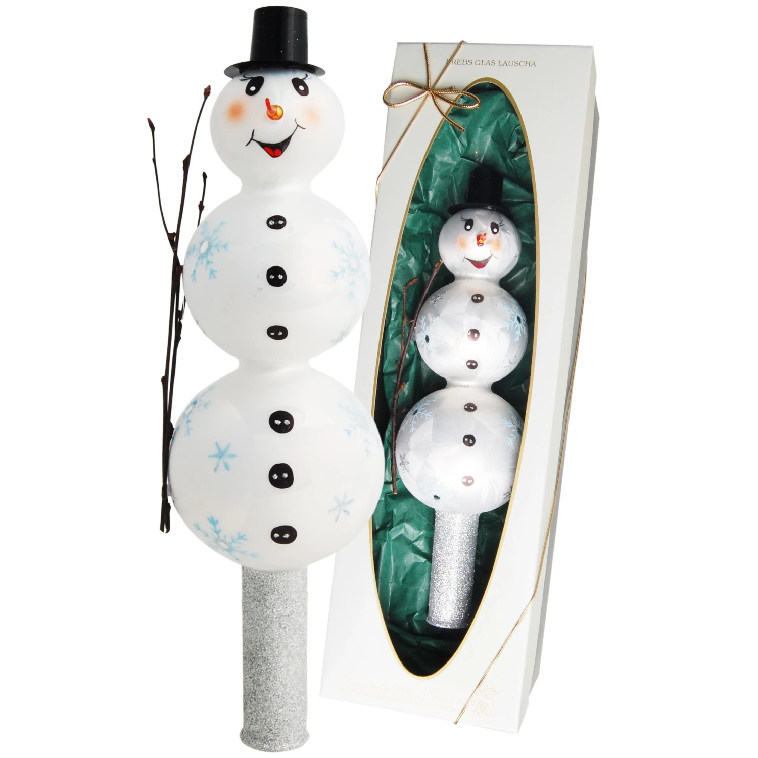 - Lieferumfang: Eislack weiß 27cm große Schneemannspitze mit Zweig und Zylinder, Glasornament, mundgeblasen und handdekoriert