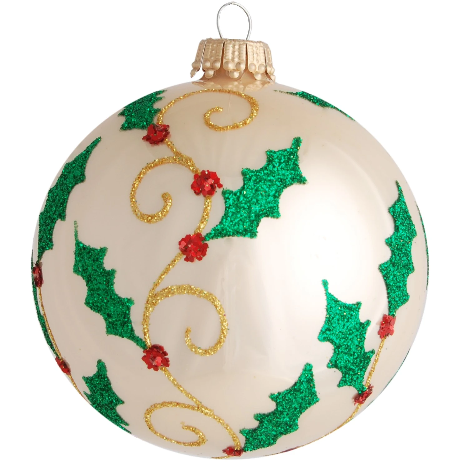 - Lieferumfang: Elfenbein glanz 8cm Glaskugel mundgeblasen und handdekoriert mit Ilexranke (6 Stück)