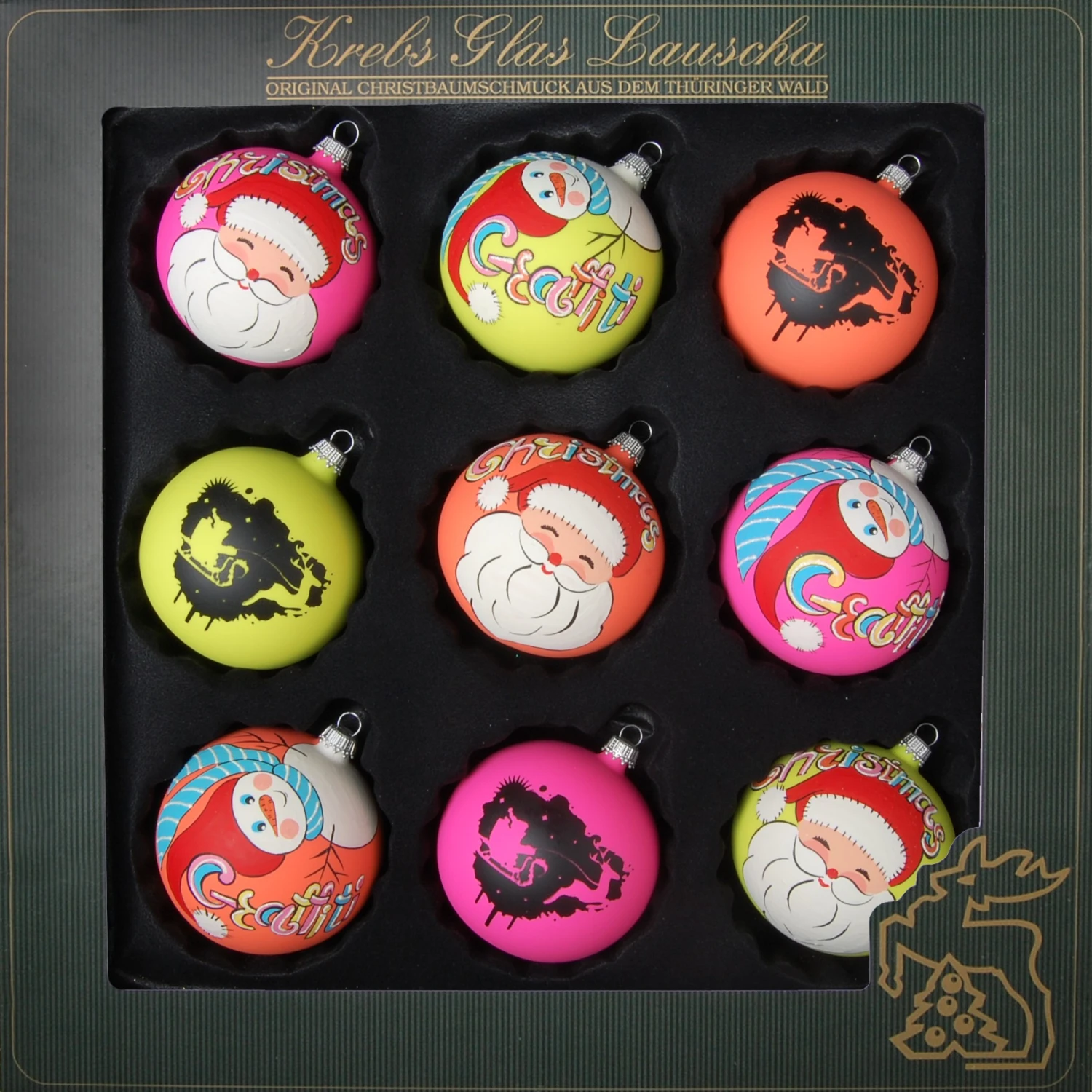 - Lieferumfang: Graffiti-Sortiment 8cm Glaskugeln neon, mundgeblasen, handdekoriert (9)
