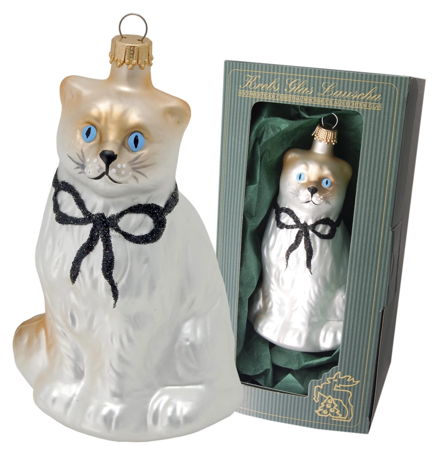 - Lieferumfang: Katze weiß mit schwarzer Schleife 13cm, Glasornament, mundgeblasen, handbemalt (1)