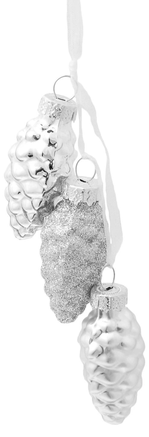 - Lieferumfang: Silber glanz/Silber satin/Silber beglittert 6cm Set aus 2×3 Stück Minitannenzapfen mit Textilband