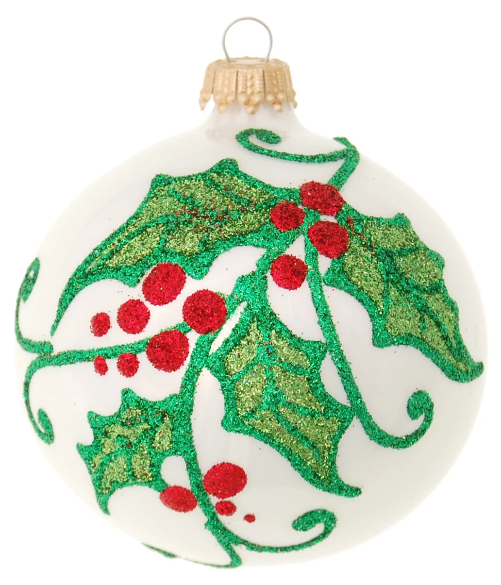 - Lieferumfang: Porzellanweiß glanz 10cm Glaskugel mundgeblasen und handdekoriert mit Ilexdekor (4 Stück)