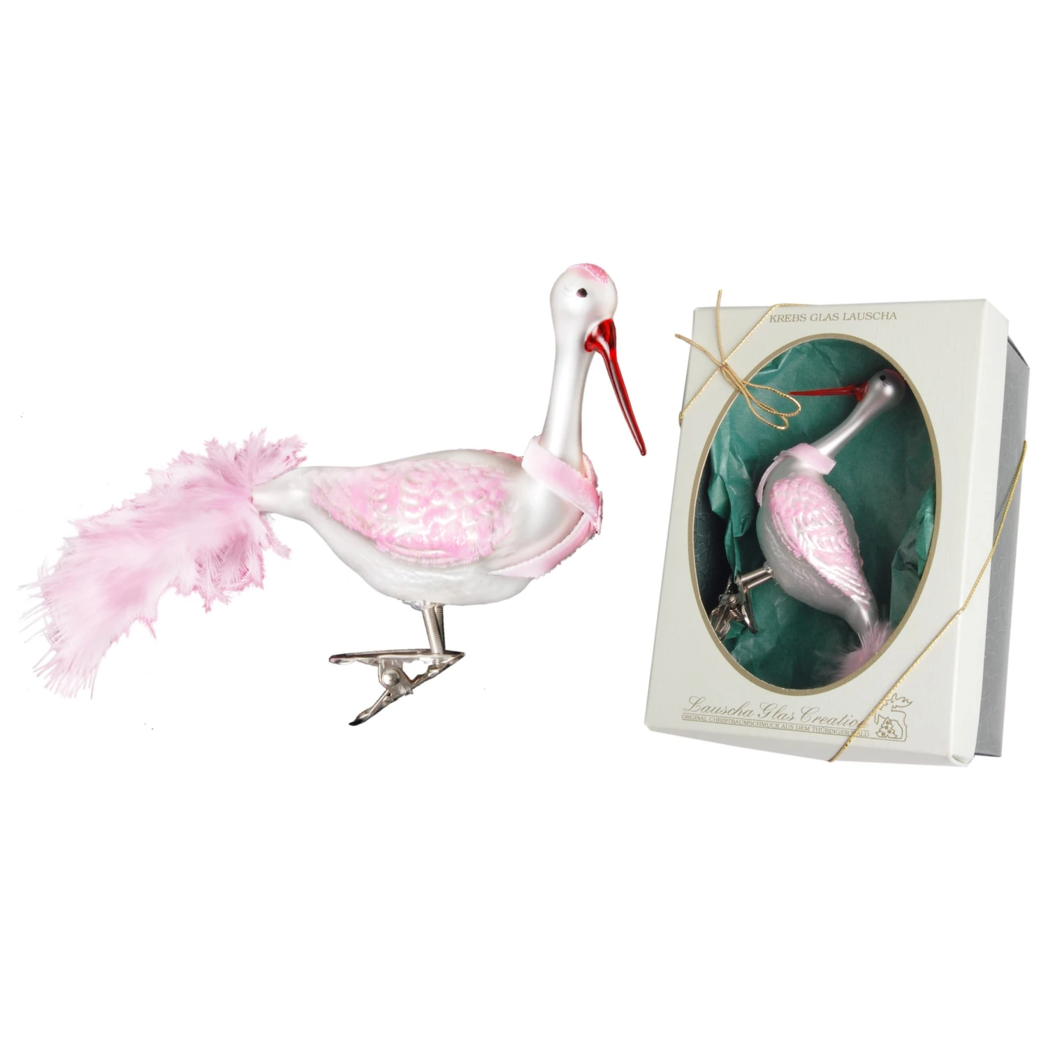 - Lieferumfang: Rosa / Weiß 12cm Storch aus mundgeblasenem Glas mit rosa Schleife auf Clip, handdekoriert mit 6cm echtem Federschwanz (1)